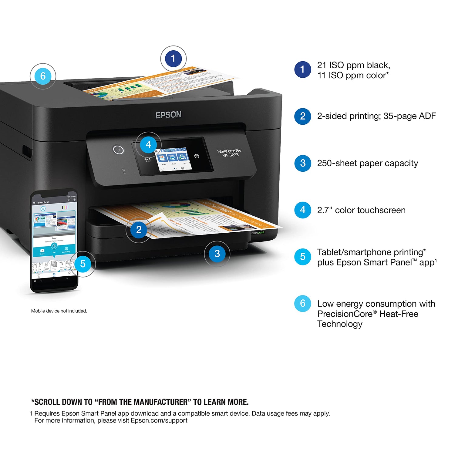 Details: Bring a new level of productivity to your business with the ultra efficient WorkForce Pro WF-3823 all-in-one printer. Designed for high-volume print environments, the WF-3823 delivers precise, professional-quality prints at fast speeds up to 21 (black)/11 (color) ISO ppm (†) using vibrant DURABrite® Ultra instant-dry pigment inks. A breakthrough in business printing, the WF-3823 features Epson’s innovative PrecisionCore Heat-Free Technology™ designed for enhanced reliability with minimal downtime. Built with convenience in mind, the WF-3823 offers a variety of user-friendly features to support easy, streamlined printing for small workgroups, including auto 2-sided printing, a large, 250-sheet paper capacity, built-in wireless and a 2.7" color touchscreen for quick navigation and control.