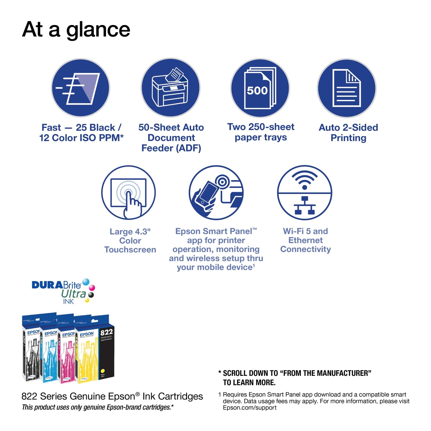 - Easy to use — 4.3" color touchscreen for quick navigation and control, plus all-new Epson Smart Panel App (1) for enhanced connectivity and productivity from your mobile device.