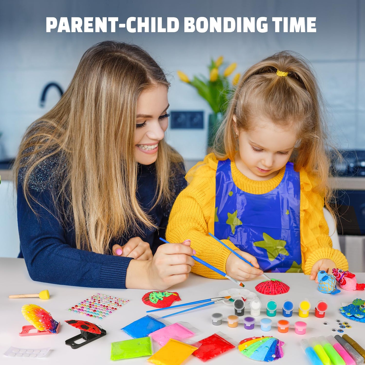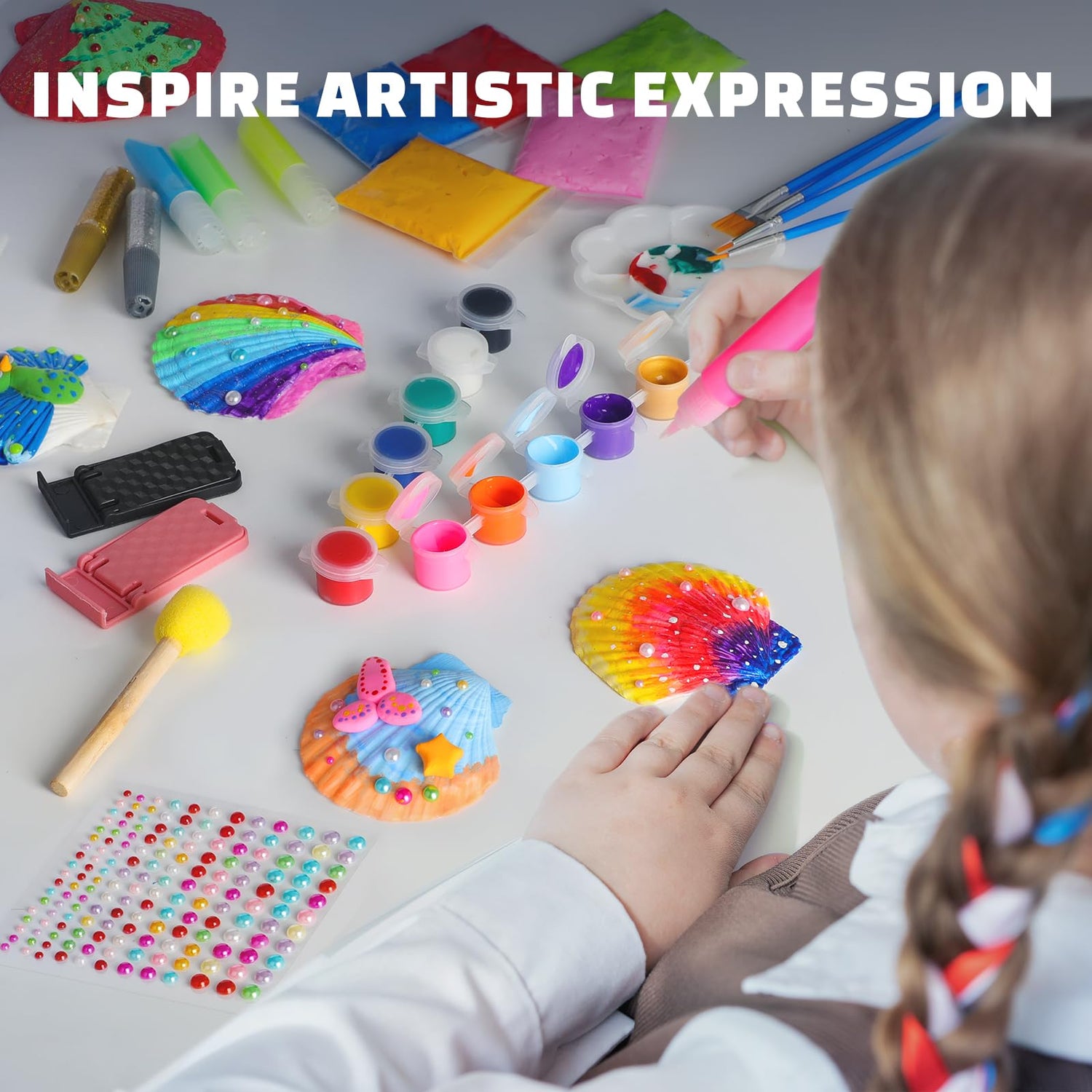 - Super Value Painting Crafts - This kids crafts includes 10 Real seashells, 2 Conchs, 10 Standard paints &2 Metallic paints, 2 Glitter glue, Glow-in-the-dark paints, 5 Modeling clays, Pearl stickers, 10 Eyes stickers, Double-sidedadhesive dots, Paint tray & Paintbrushes(fine tip and wider tip), Sponge stick, 2 Holders, Disposable apron & Disposable tablecloth