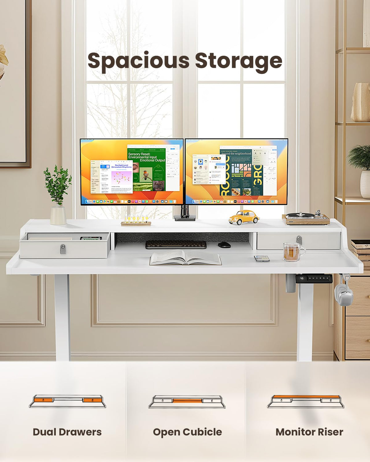 ErGear Electric Standing Desk with Drawers, 55″ x 28″ Gaming Desk with Monitor Stand, C-Clamp Mount Compatible, Home Office Height-Adjustable Desk with Storage Shelf, 4 Preset Heights, White, EGESD37W