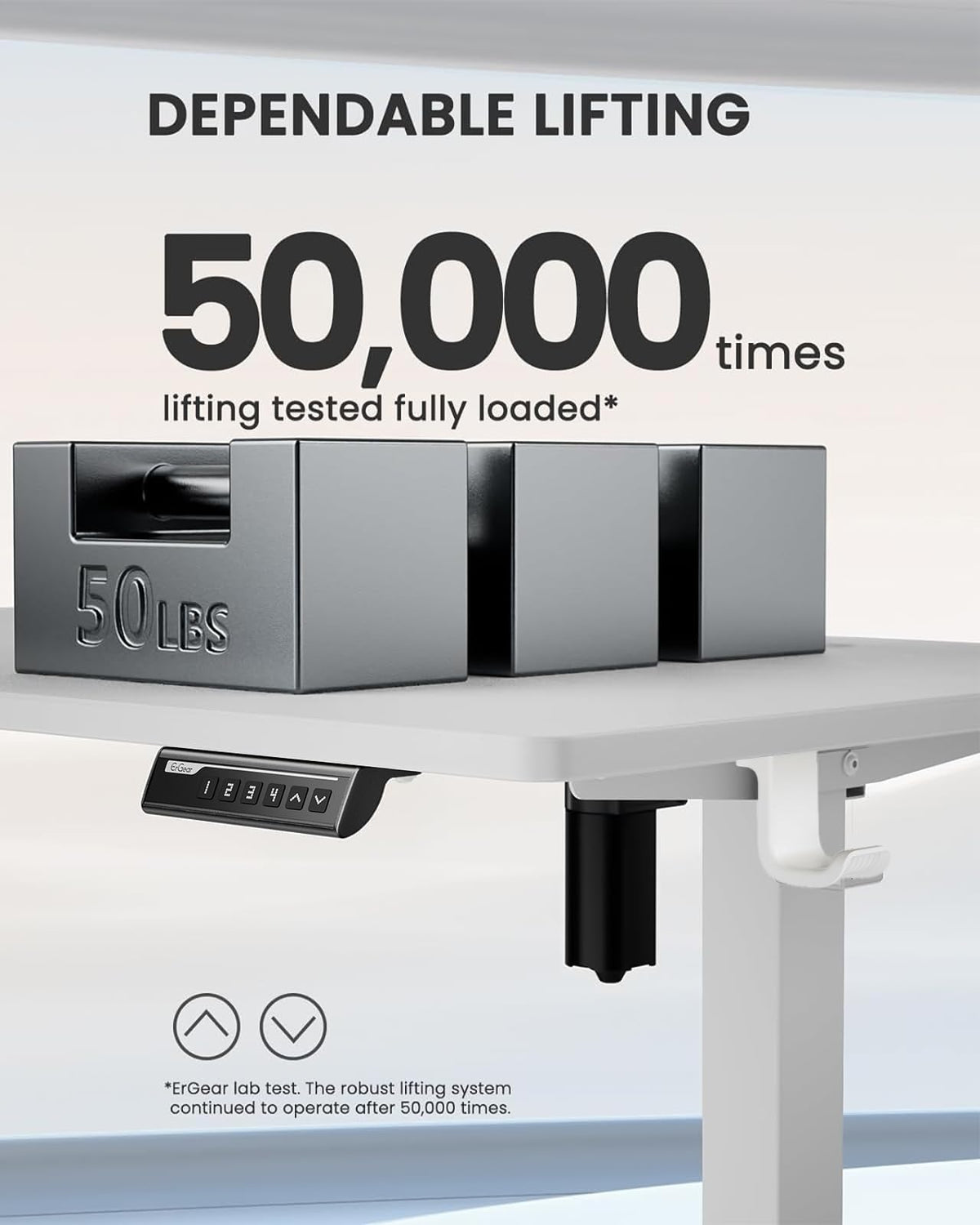 Details: ErGear enhances your workspace with dependable, scientifically-designed ergonomic products. We believe that making every hour a bit more flexible and comfortable leads to a life with greater freedom. Work & Play More Freely Complete Flexibility. Total Freedom Find a better way of working. Sit or stand, and switch easily anytime with this Electric Standing Desk. Be more productive and comfortable. Sturdy & stable solid steel frame. Aerospace-grade lifting column connectors. Powerful lifting system tested 50,000 times. High load capacity (176 lb) to hold & lift more. Wide height adjustment and 3-setting memory. UL-certified for performance, durability, and safety. Specifications. Desktop Sizes: 40" x 24" / 48" x 24" / 55" x 28" / 63" x 28" Color: Black, Natural, Vintage Brown3 Custom Height Settings Instant one-press access to the heights you use.A Breath of Fresh AirTo save new trees, we use recycled waste wood (like quality-graded timber mill wood chips). You can also breathe easy because our desks meet EPA and CARB safe air standards with low emission of VOCs like formaldehyde.Fast 30-Minute Assembly The streamlined assembly process means less steps, stress, and struggles. Just follow the clear Electric Standing Desk instruction manual & video.Intuitive ControlThe minimalist, modern controller of this Electric Standing Desk enables smart and smooth adjustment.UL-Certified & FCC-CompliantThis Electric Standing Desk is designed and manufactured to a higher standard. Thoroughly tested (under UL 964) to ensure performance, durability, and safety. Also meets strict FCC Class B home device regulations.