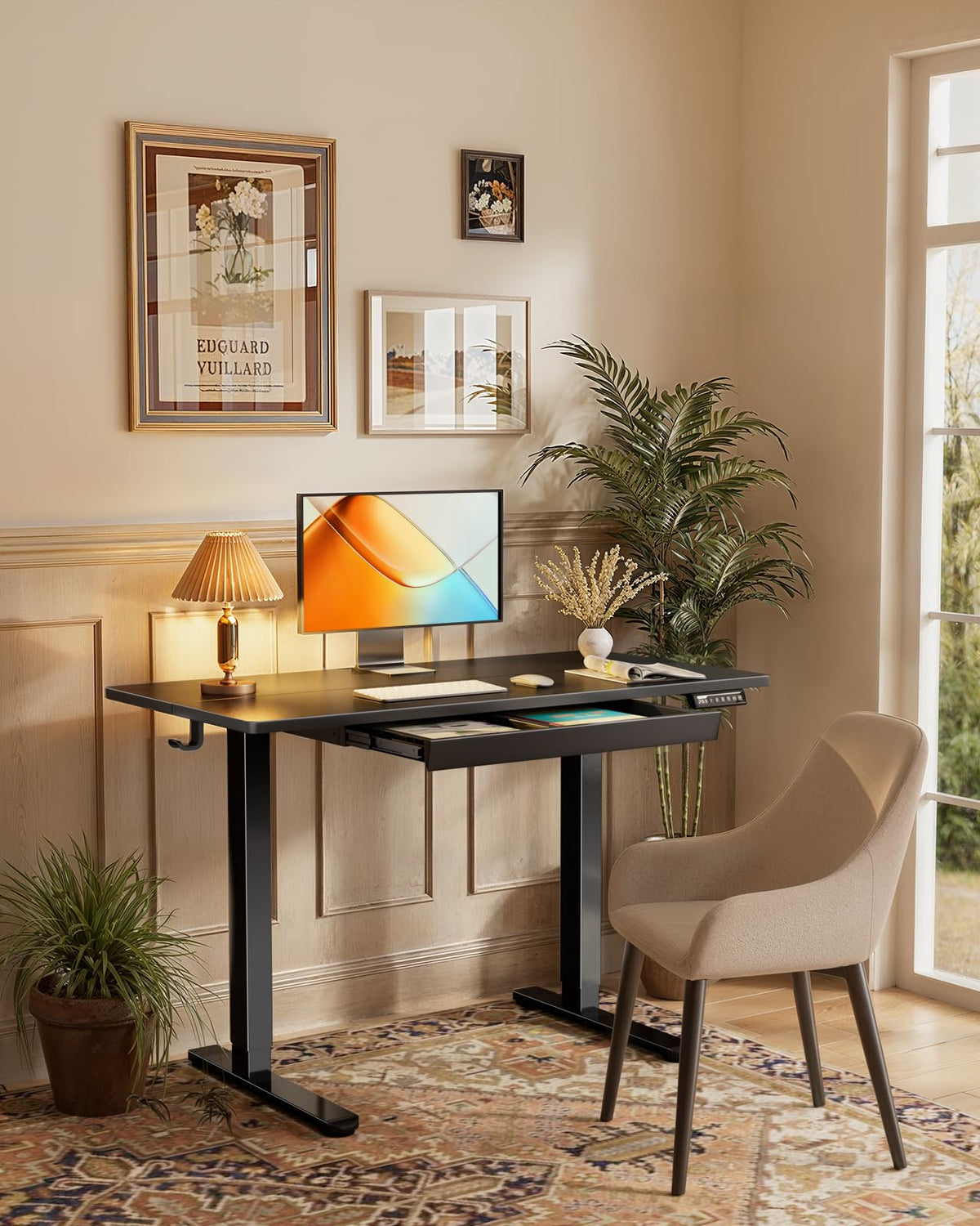 ErGear Standing Desk with Drawer, 48 x 24 inch Electric Height Adjustable Desk with 4 Preset Heights & 2 Storage Hooks, Sit Stand Desk Computer Desk with Drawer for Home & Office, Black EGESD80B