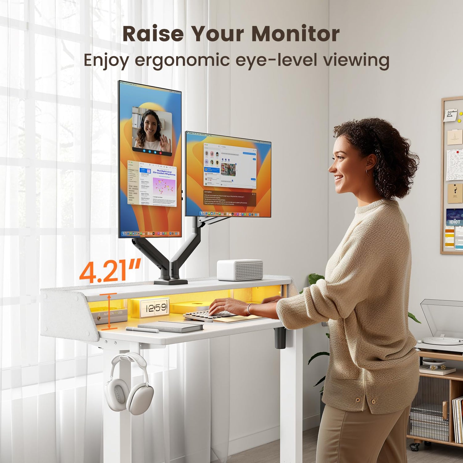 - Practical Storage Solutions: The standing desk with storage includes a shelf backstop to keep items from falling along with 2 storage hooks for your headphones or bags. Cable clips provide efficient cable management underneath the desk to maintain a clutter-free and functional workspace.