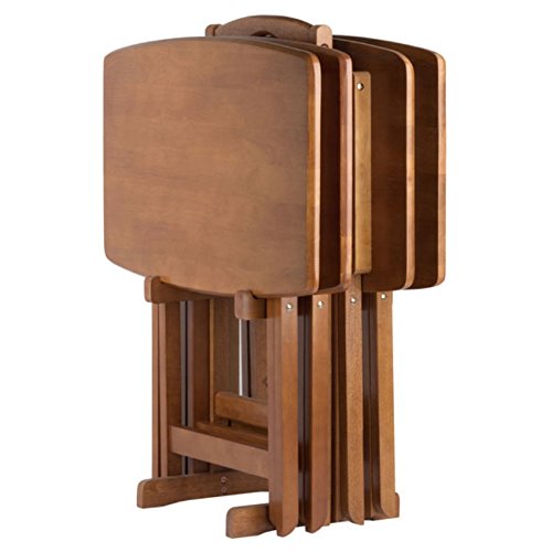 Details: Make entertaining simple and easy with the Ergode Wood Dylan 5-Piece Snack Table Set. A perfect companion piece for a casual meal in front of the TV or on the patio. This versatile set includes four folding snack tables with oversized tops. The classic rectangular shape of these snack tables has gently curved sides, rounded corners and are oversized for more table space. Ideal for setting out appetizers, so bring out the set and pull up the tables as you and your guests sit back. Great for daily use and compact enough to store in the closet. For convenience an upright stand is an innovative addition to this set as it serves as a rack to store the folded tables discretely when not in use. Constructed of solid wood in a teak finish, this set of foldable tables easily open up to X-frame bases which make these table not only look good but also help with stability. Conveniently packed and shipped in 1 box. Tables arrive ready to use and require no assembly. Minimal assembly is required for the stand and hardware necessary is included. Replacement part request can be submitted directly to the manufacturer within 60 days from date of purchase. Individual Tray Size: 23.6"W x 15.75"D x 25.5"H (open) Dimensions of Stand with trays stored: 23.6"W x 12.3"D x 31.4"H Static Maximum Weight per Tray: 25 lbs. Tables come fully assembled Storage Stand requires assembly Ships in 1 box . Dimension: 23.62" W x 15.75" D x 25.51" H, Weight: 48