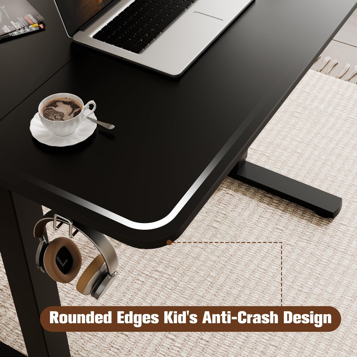 - Spacious Work Area: The desktop size of this standing desk is 35.4 x 23.6 inch, which provides space for various monitors and laptops. You can put all the necessary office supplies on your electric stand up desk. There are hooks on both sides of the table so that you can hang the bags or headphones for easy storage
