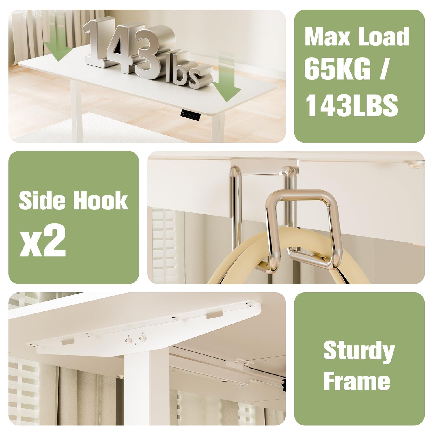 - Spacious Work Area: The desktop size of this standing desk is 63 x 27.5 inch, which provides space for various monitors and laptops. You can put all the necessary office supplies on your electric stand up desk. There are hooks on both sides of the table so that you can hang the bags or headphones for easy storage