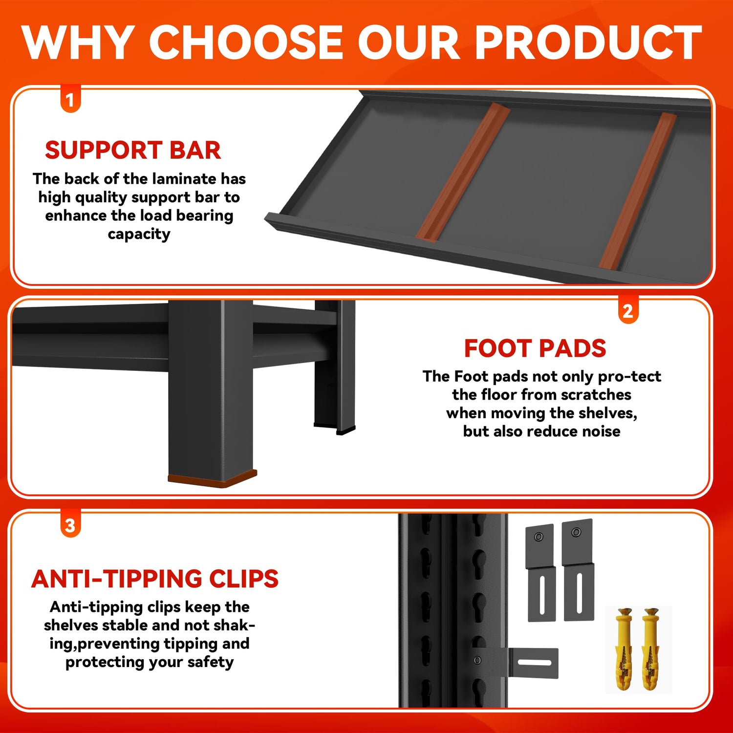 • 【Extremely Sturdy & Durable Garage Shelving】Constructed from high-strength premium cold-rolled steel with advanced powder-coated technology, this metal shelving unit resists rust, oxidation, and wear. The industrial-grade coating not only enhances aesthetics but also boosts durability, making it a heavy-duty shelving solution for long-term use