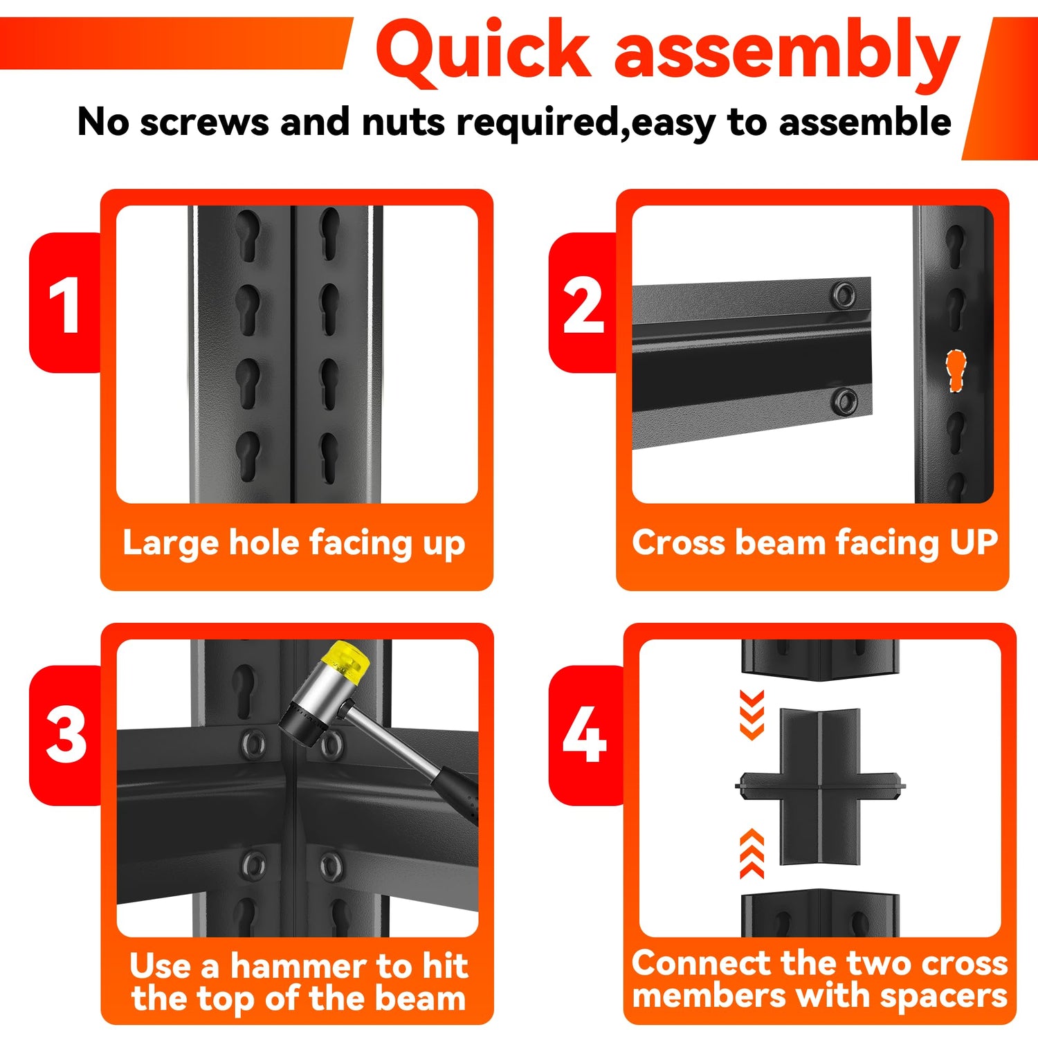 Details: This garage shelving unit features a double-layer post design that prevents hand cuts and scrapes, eliminating the issue of flimsy single-layer posts that are prone to causing scratches. Crafted from high-strength premium cold-rolled steel with advanced powder-coated technology, it resists rust, oxidation, and wear. The industrial-grade coating not only enhances aesthetics but also boosts durability, making it a heavy-duty shelving solution for long-term use. Each tier's height is easily adjustable by relocating the crossbars, allowing you to accommodate items of varying sizes and meet personalized needs, serving as a versatile helper for homes or workplaces, whether for garage organization or workshop storage. Assembly requires no nuts or bolts, and with the included hammer and gloves, you can effortlessly put together each standalone shelf in minutes. Additionally, 24/7 customer support is provided; if any parts are damaged or missing, a swift resolution will be offered within 24 hours. Engineered with industrial-grade cold-rolled steel for superior strength and weldability, this shelving unit outperforms wooden racks that are prone to warping or moisture damage. Reinforced crossbars and stabilizing braces ensure unwavering stability even under heavy loads, with no wobbling or bending over time.
