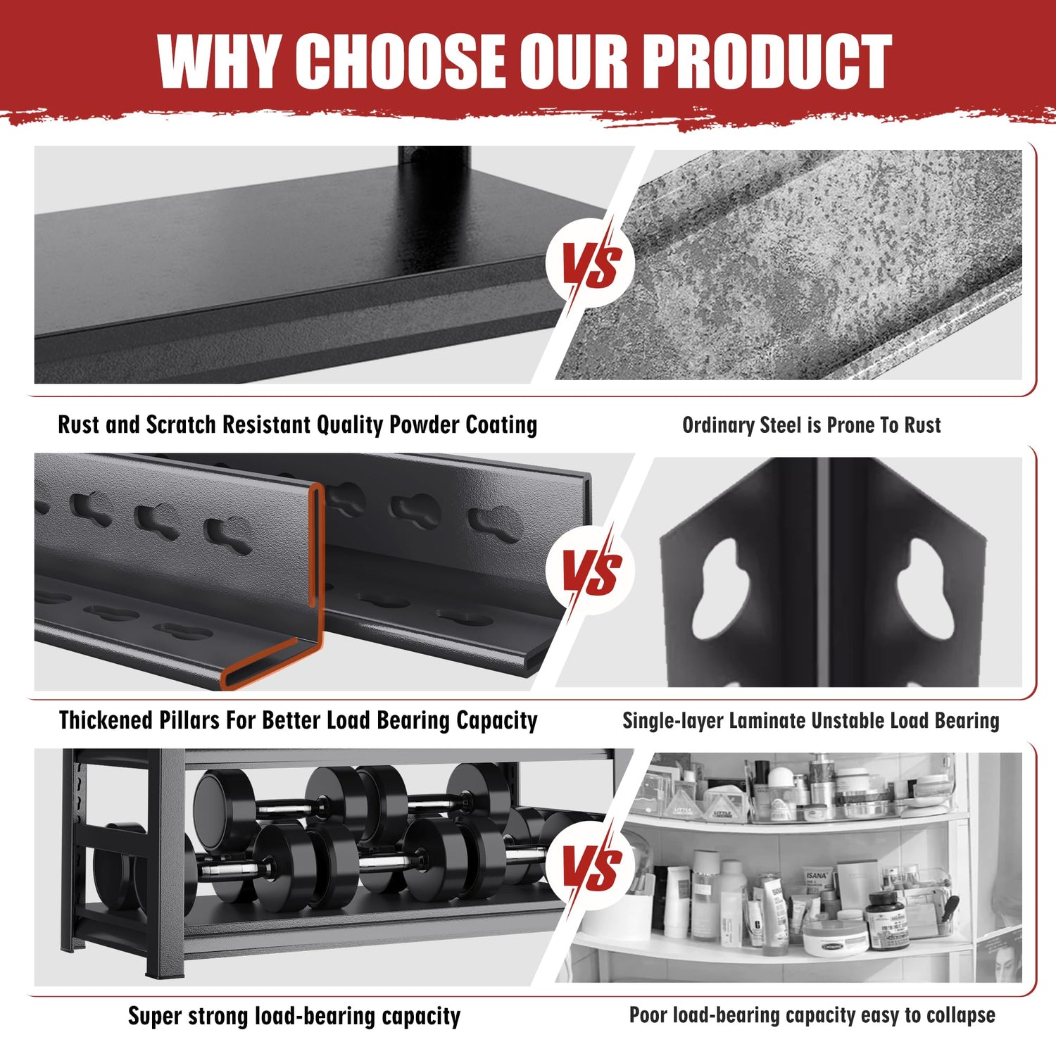 • 【Extremely Sturdy & Durable Garage Shelving】Constructed from high-strength premium cold-rolled steel with advanced powder-coated technology, this metal garage shelving unit resists rust, oxidation, and wear. The industrial-grade coating not only enhances aesthetics but also boosts durability, making it a heavy duty garage shelving solution for long-term use