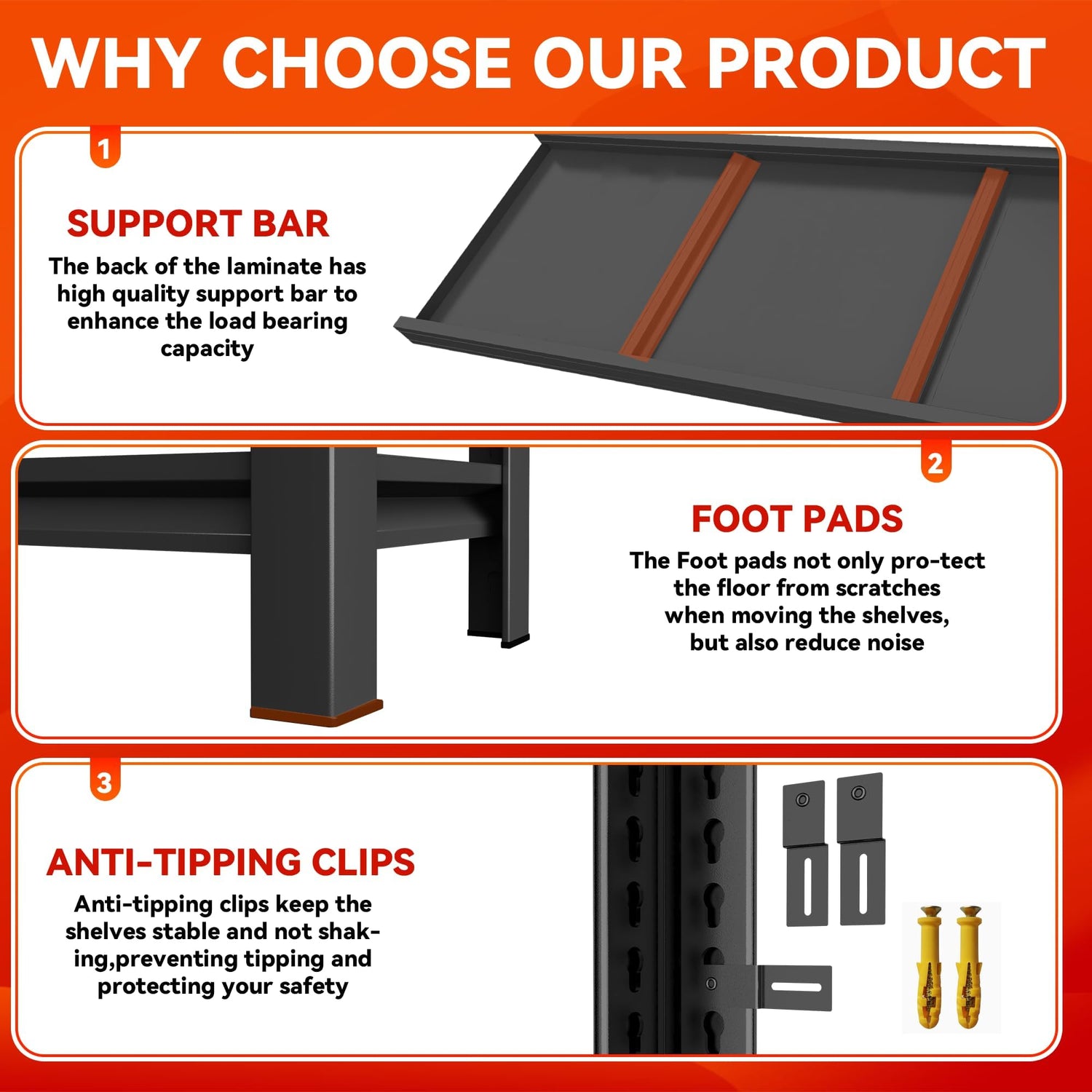 - 【Extremely Sturdy & Durable Garage Shelving】Constructed from high-strength premium cold-rolled steel with advanced powder-coated technology, this metal shelving unit resists rust, oxidation, and wear. The industrial-grade coating not only enhances aesthetics but also boosts durability, making it a heavy-duty shelving solution for long-term use