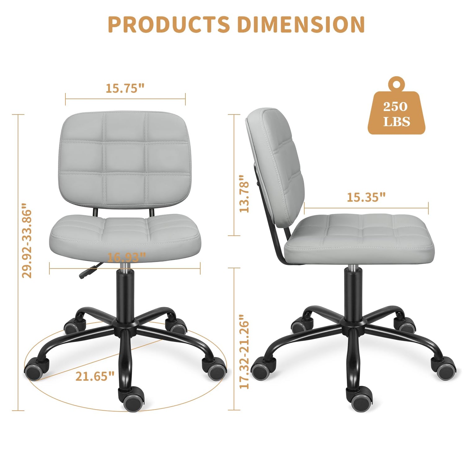 - Adjustable Space Saving: The height-adjustable dimensions ensure the small armless office chair will fit perfectly into any office or workspace. The armless design makes it easy to store it under your desk when not in use, maximizing the available space in your office, bed room, and vanity area.