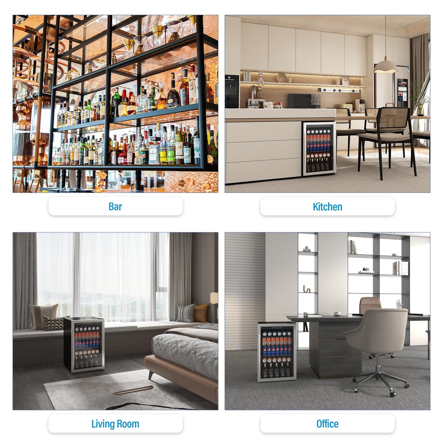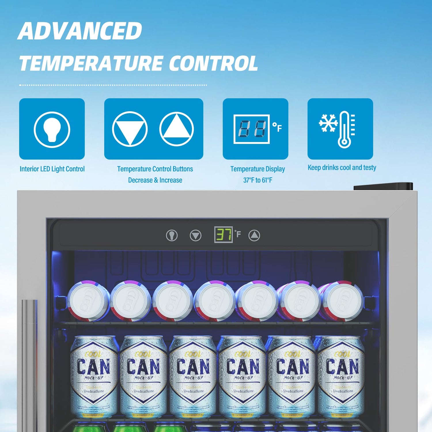 • With its large internal storage design, this under-counter beverage cooler can hold up to 145 standard sized soda or beer cans, or several bottles of wine. It comes with 4 adjustable and removable chrome shelves to organize your drinks conveniently.