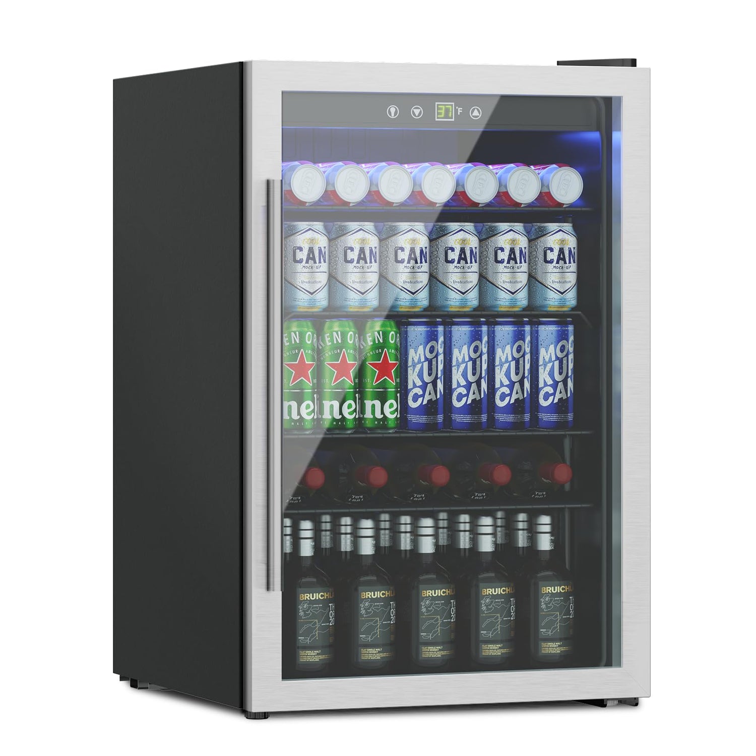 • Keep your favorite drinks perfectly chilled with the Erivess Beverage Refrigerator and Cooler. This 4.5 cubic feet, free standing beverage refrigerator features an elegant see-through, left-hinge glass front door with a stainless steel frame that allows you to view your wine, beer, or soda at a glance.