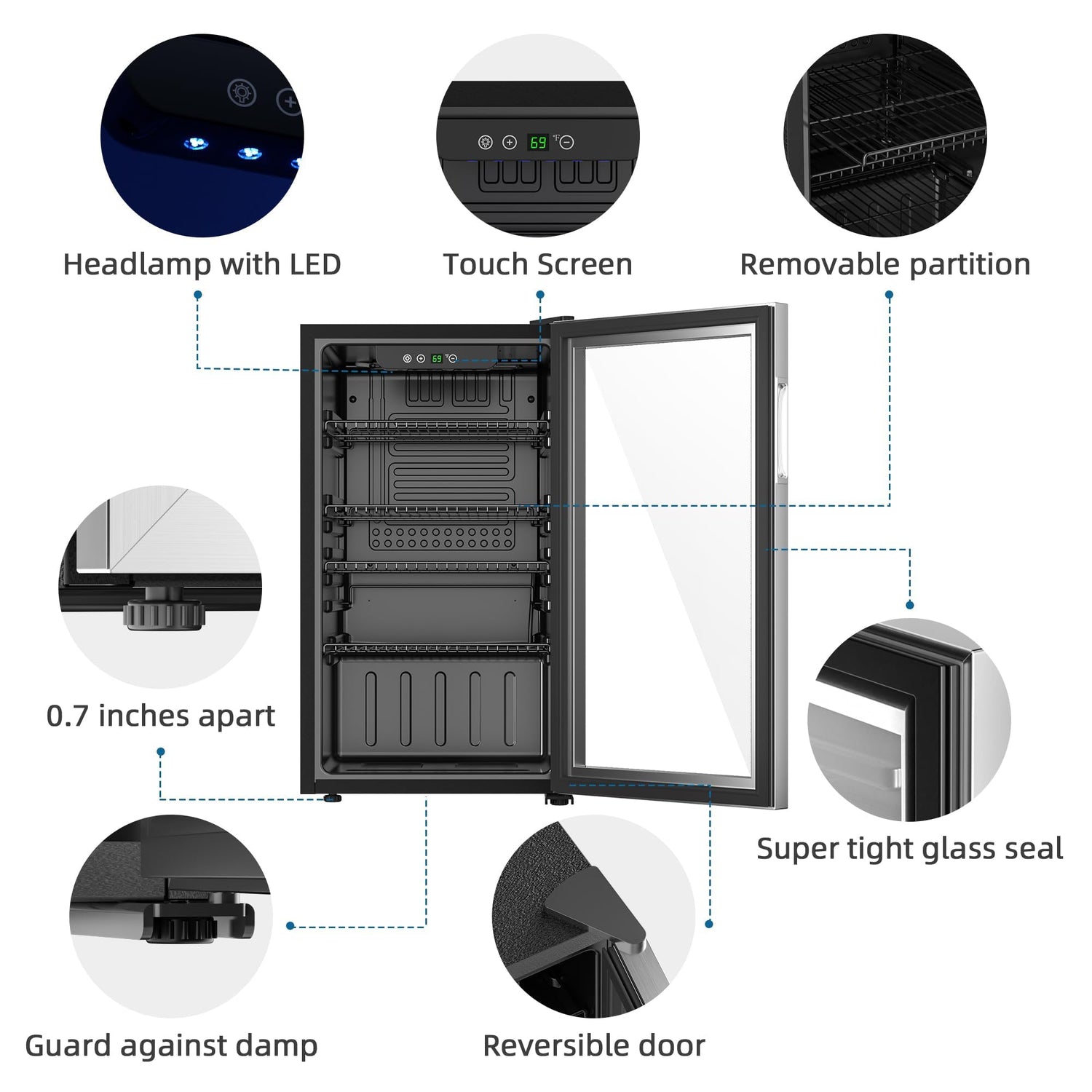 - Keep your favorite drinks perfectly chilled with the Erivess Beverage Refrigerator and Cooler. This 3.2 cubic feet, free standing beverage refrigerator features an elegant see-through, left-hinge glass front door with a stainless steel frame that allows you to view your wine, beer, or soda at a glance