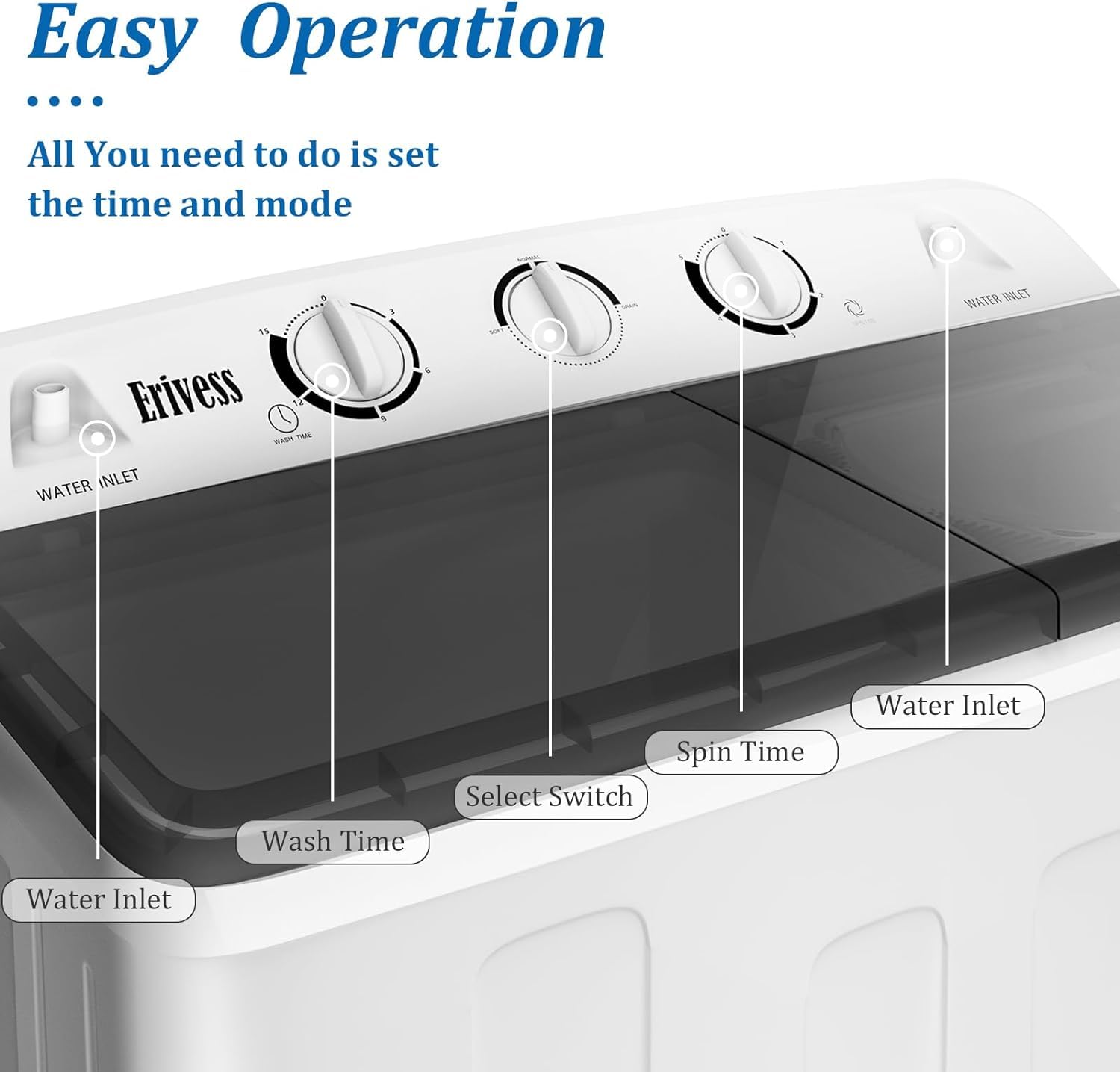 Erivess Compact Mini Twin Tub 32 lbs Washing Machine with Drying Rack& 10 Hangers, 20 lbs Washer Mini Compact Laundry Machine and 12 lbs Spinner, Convenient and Efficient for Dorms, Apartment