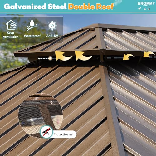 EROMMY 10' x 12' Hardtop Gazebo, Galvanized Steel Double Roof Gazebo with Aluminum Frame, Permanent Outdoor Metal Pavilion with Curtain and Netting for Patio, Lawn and Garden