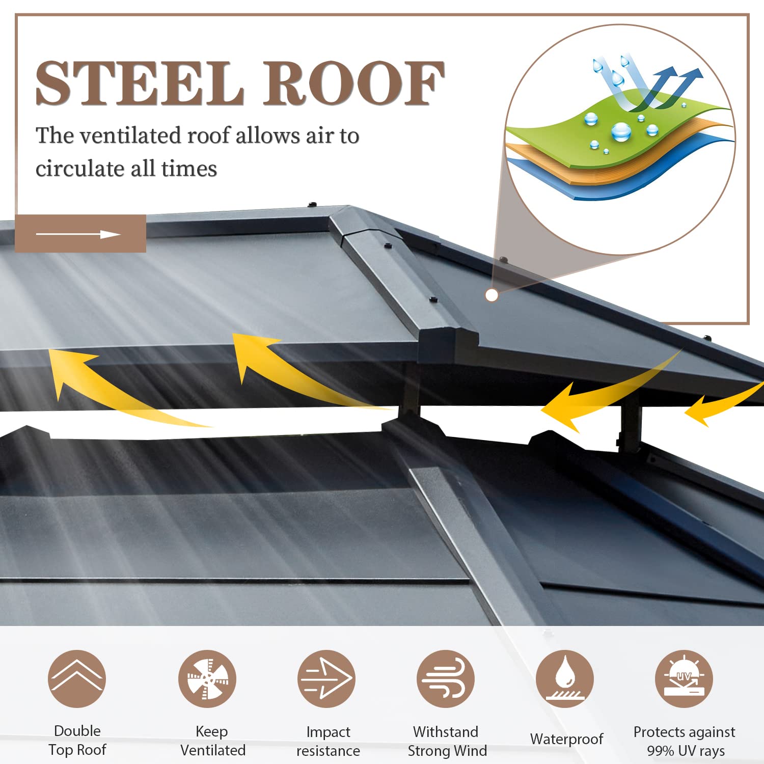- 【VENTED DOUBLE HARDTOP】Compared with one layer design, this double gazebo canopy allows sunlight to filter though and provides excellent airflow and the sloped roof allows rainwater to slide right off. Hardtop gazebos for patios can tolerate high summer temperatures and withstand UV rays, provides you plenty of cool shade to enjoyment. Finally, the interior hooks on the ceiling can be used for hanging the lamp or heater.