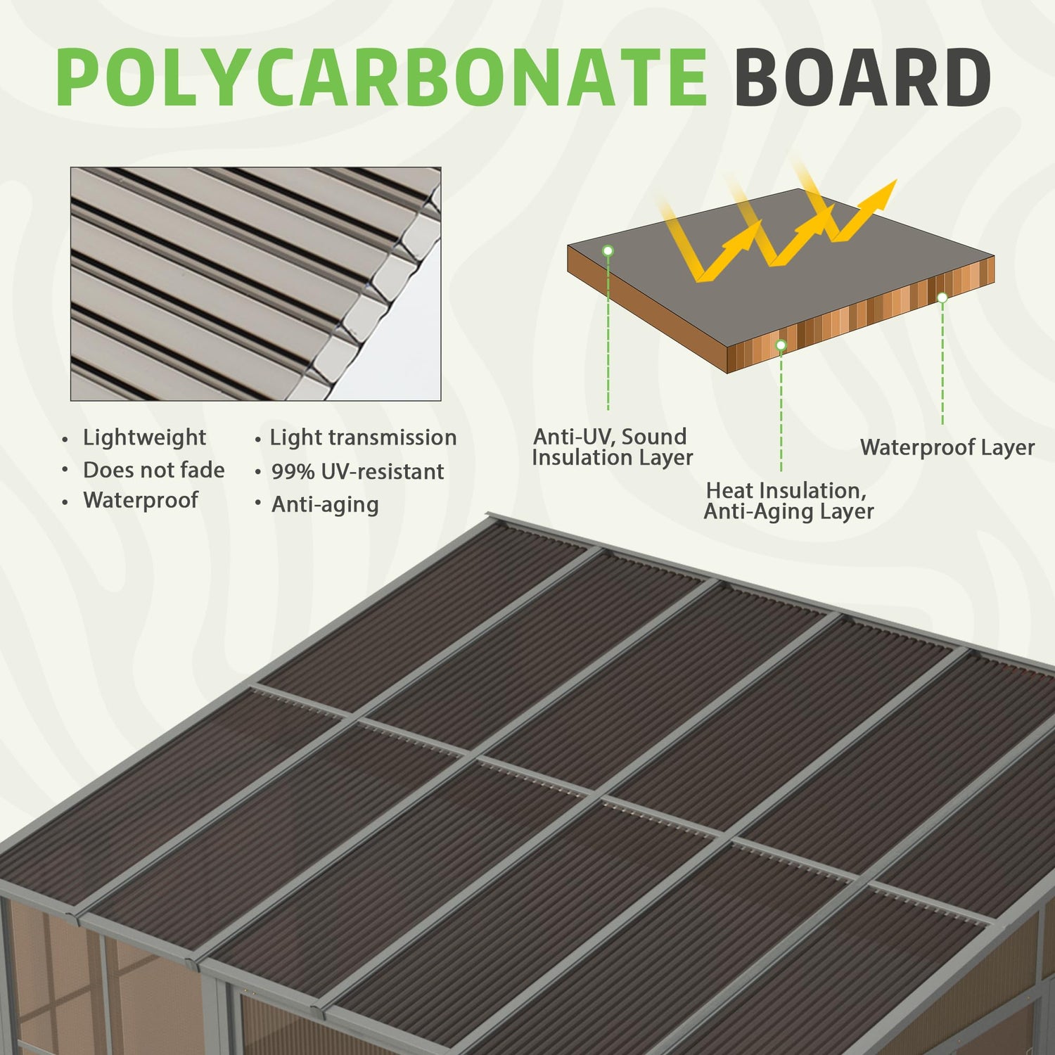 • 【HIGH-QUALITY PC PANEL】: The outdoor sunroom uses PC panels. This material can not only ensure sufficient indoor light, but also block harmful ultraviolet rays and protect privacy. The 6mm thick thickened panels make the sunroom greater stability and weather resistance.