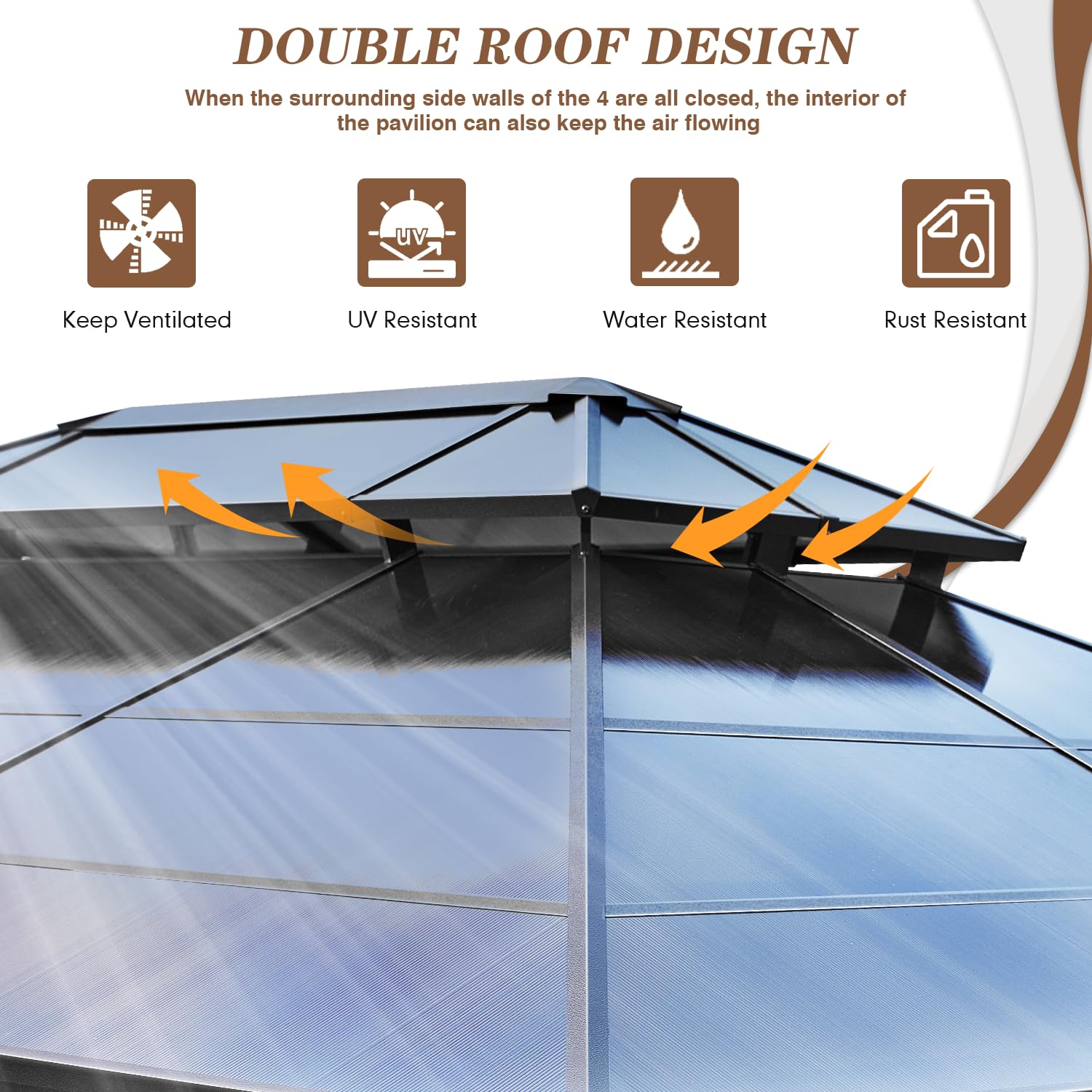 - [ POLYCARBONATE DOUBLE ROOF TOP ] Double roof gazebo has better ventilated and optimum airflow. Using polycarbonate top lets light in but keep the heat down and UV-block 99%, offers a place to enjoy the weather
