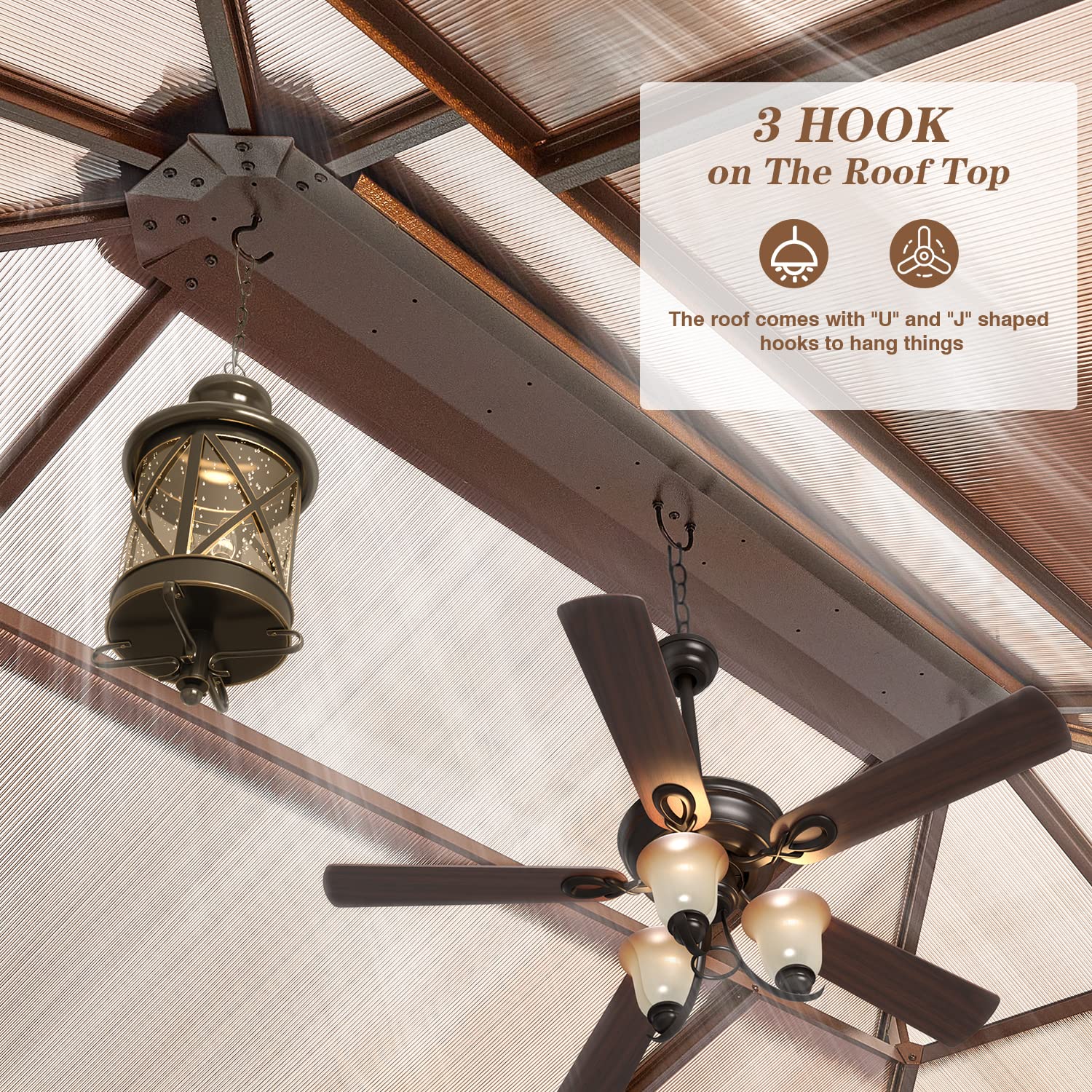 - [ SUPPORT THREE HOOKS ] Fans and lights can be installed on the hooks to make your gazebo meet your different needs, you will spend much time of enjoyment on your patio