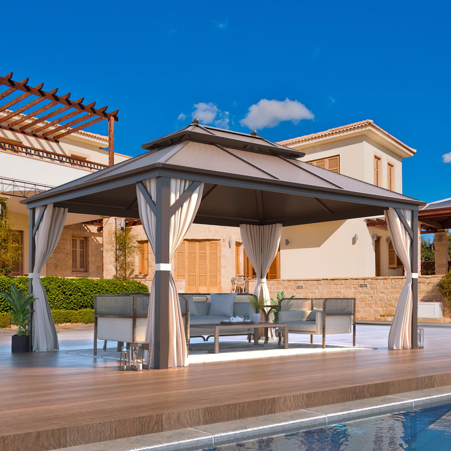 - [ STRONG & STURDY ] 10' X 13' permanent hardtop gazebo. Beautiful hard metal top instead of normal fabric or polycarbonate material. Compare to a traditional soft top, Galvanized steel metal top can withstand heavy snow, Powder-coated gazebo aluminum frame, which is sturdy, anti-corrosion and all weather resistant for years of use.