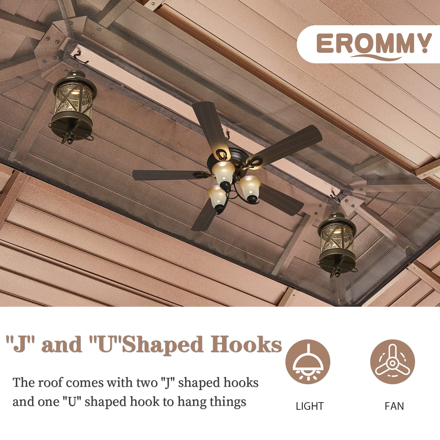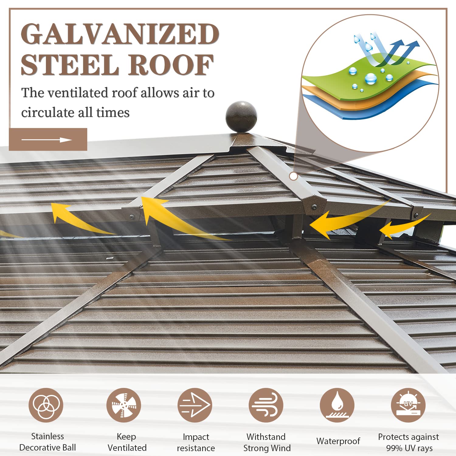 - [ VENTILATION & DECORATE ] Compared with one layer design, our double roof gazebo allows sunlight to filter though and provides excellent airflow and the sloped roof allows rainwater to slide right off. Hardtop gazebos for patios can tolerate high summer temperatures and withstand UV rays,provides you plenty of cool shade to enjoyment.Finally, the interior hooks on the ceiling can be used for hanging the lamp or heater, Create your own outdoor space.