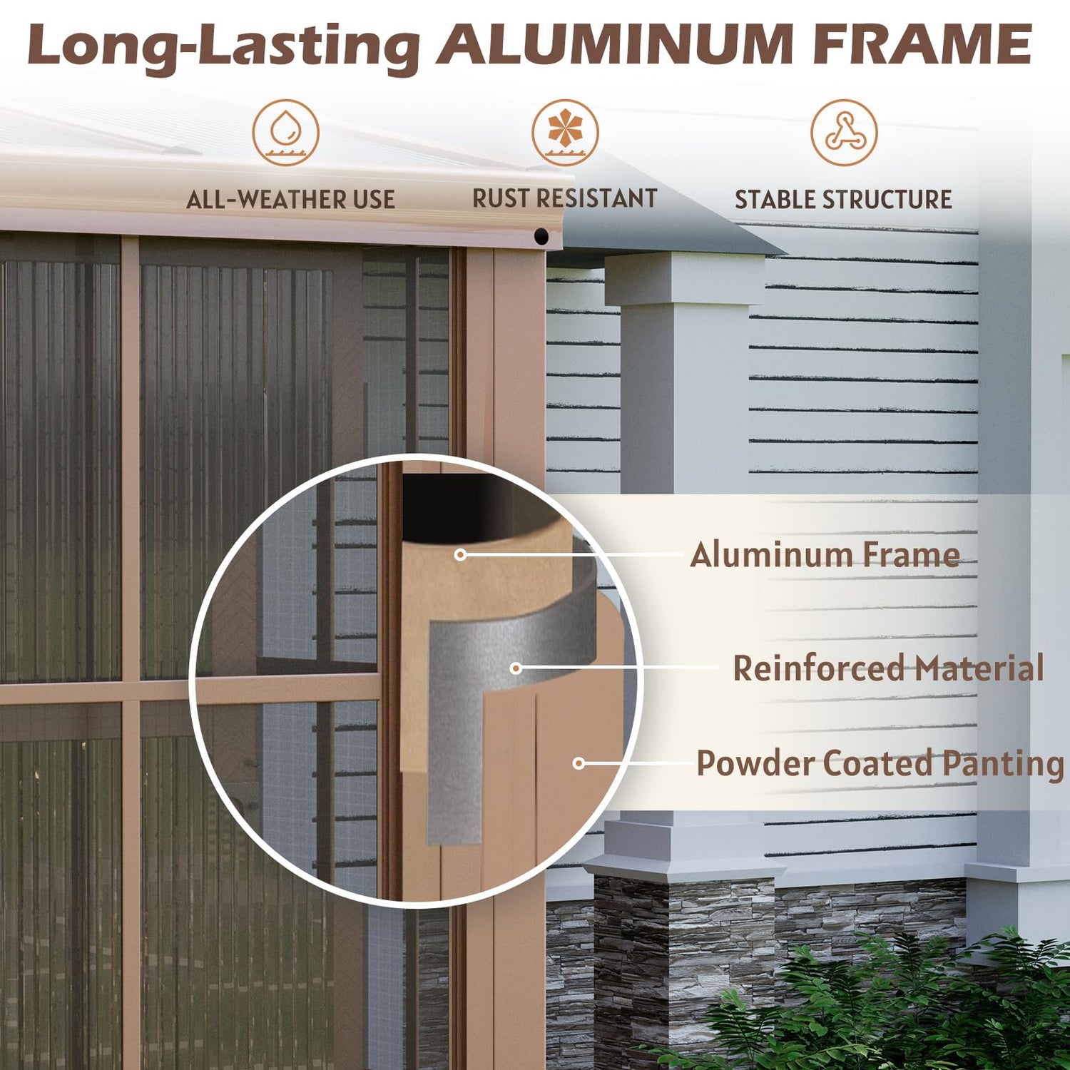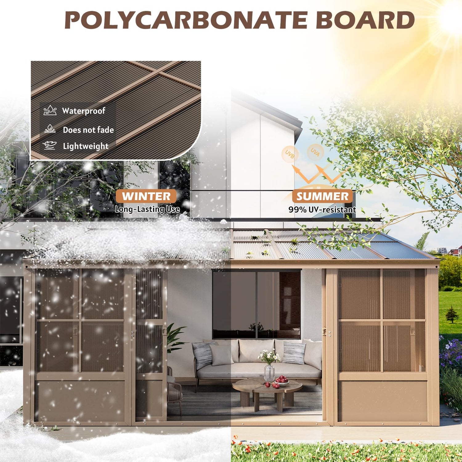 EROMMY 10' x 16' Sunroom, Wall Mounted Gazebo Solarium with Drainage Trough, Polycarbonate Roof, Lean to pergola for Garden, Permanent Sun Room with Lockable Sliding Doors, Brown