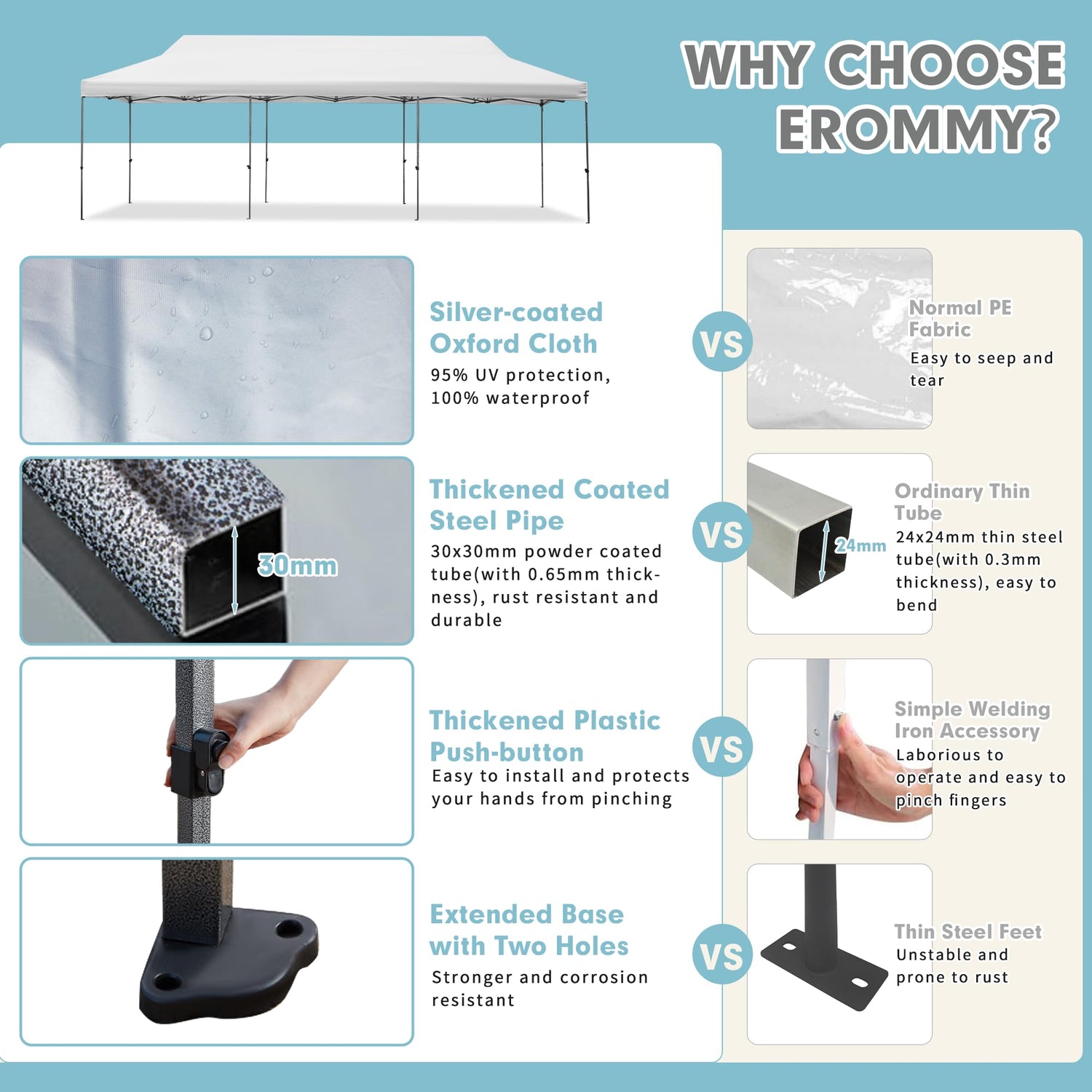 - 【Heavy Duty Upgraded Frame】This 10x30 pop-up canopy tent adopts commercial grade full truss structure, and the upgraded frame is made of durable powder-coated stainless steel (30mm diameter, 0.65mm thickness). The included 8 double barrel sandbags, ropes and L-shaped nails provide better stability for the canopy.