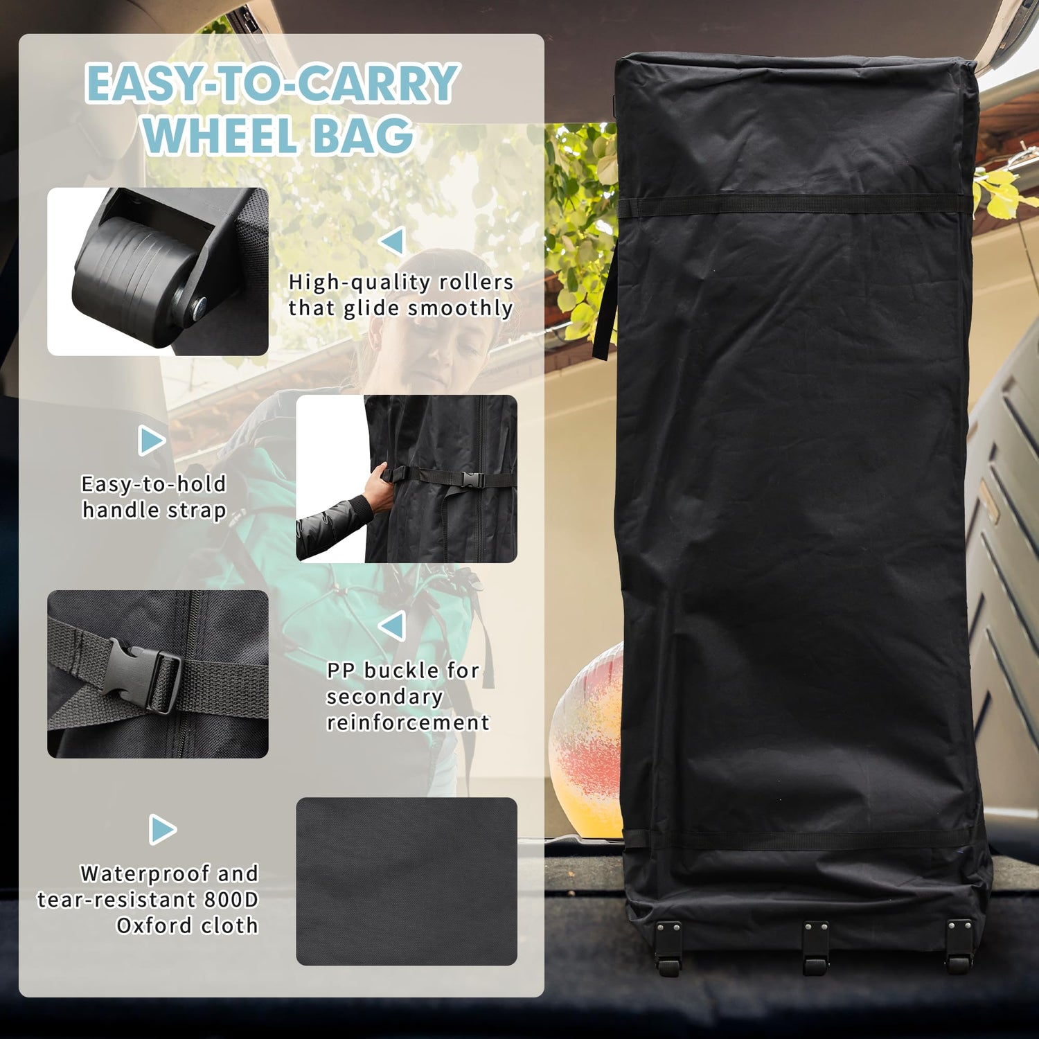 - 【Portable Roller Storage Bag】We designed an extra large storage bag for the pop-up canopy tent, as well as rollers for easy transportation and a handle for easy holding. The trolley bag is made of 800D Oxford cloth. Durable materials make this storage bag long-lasting.