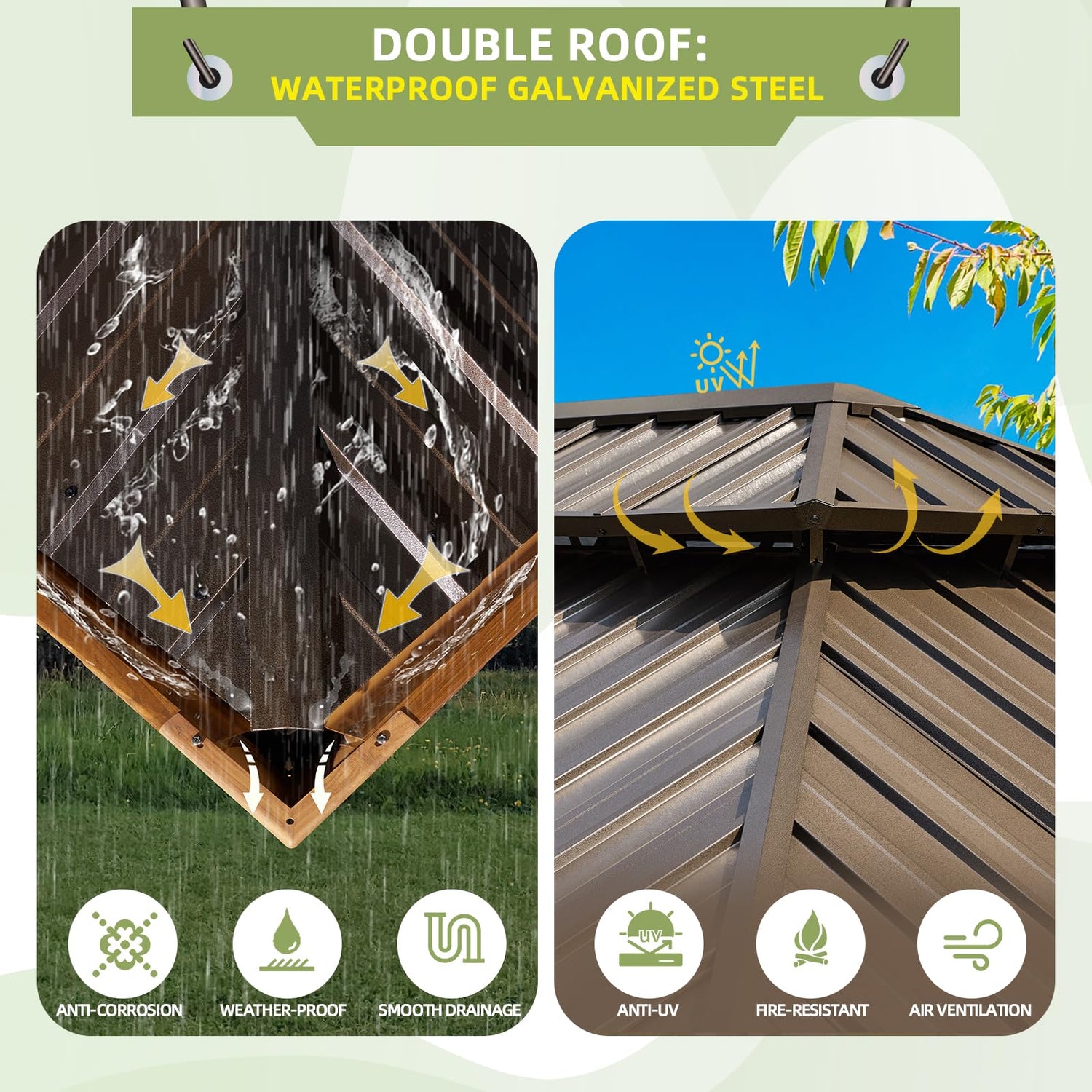 - [ Galvanized Steel Double Top ] The steel gazebo with galvanized steel roof is fade-resistant, rust-resistant, sturdy enough to withstand heavy snow and wind, and can keep out bright light and harmful UV rays. The double-top design facilitates ventilation, cooling, and slowing down the wind speed.