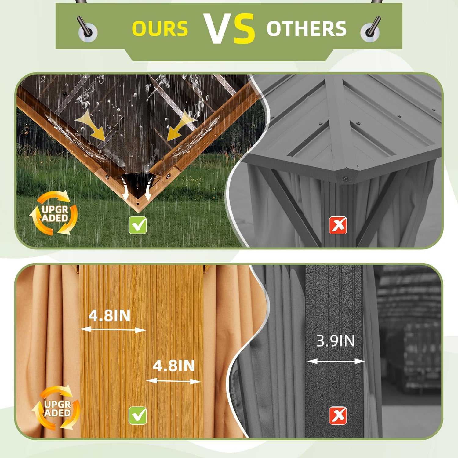 - [ Wood Grain Aluminum Frame ] Euqipped with wood-looking powder coated, the real aluminum posts look like natural wood but are sturdy and durable enough for your outdoor use. The outdoor gazebo with aluminum frame and triangular structure is more stable and stronger that won't decay or crack like real wood or rust like the iron frame but last for many years.