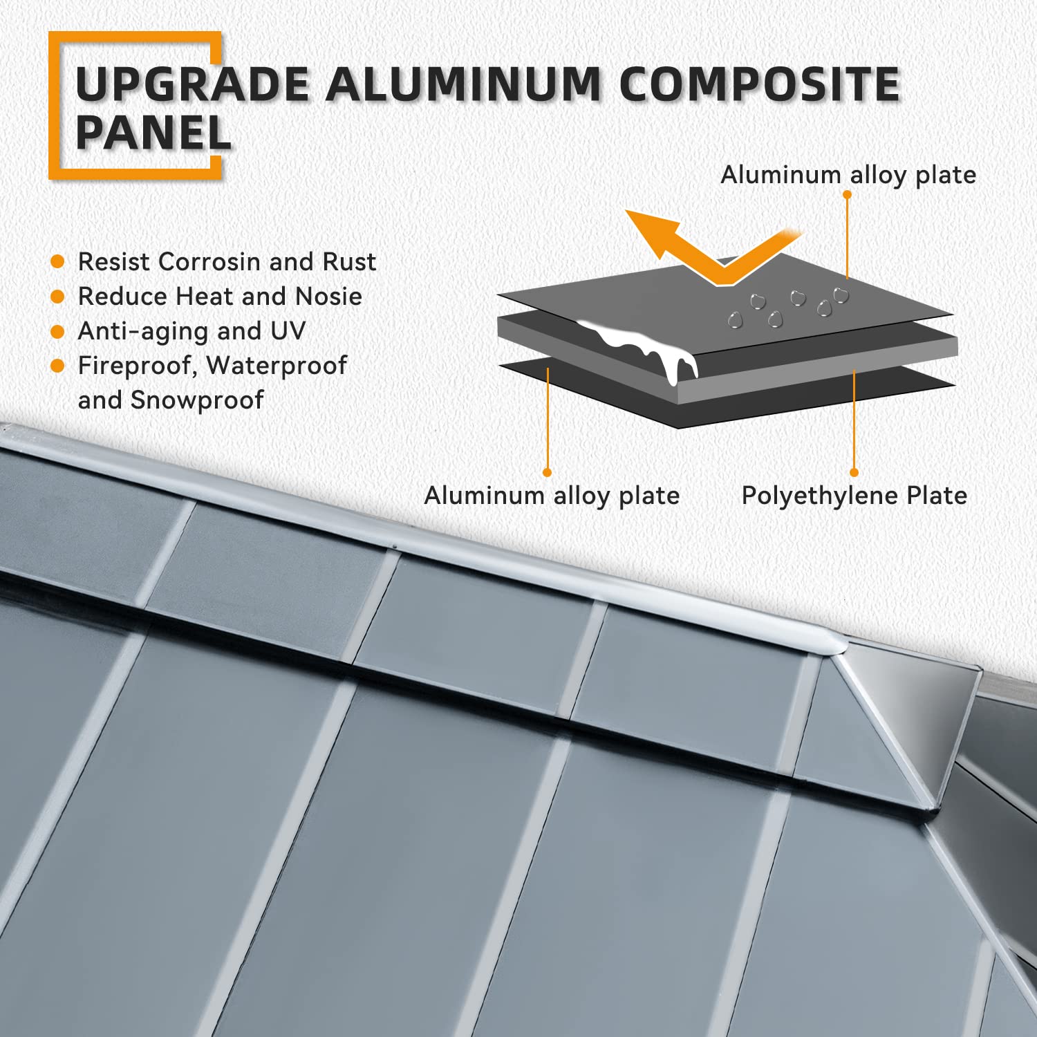 - [ Aluminum Composite Panel Roof ] This gazebo use aluminum roof. which is better performance in rust restance and last longer than steel material, and can effectively bolck all the harmful rays and has a better snow capacity than polycarbonate material. Aluminum roof is the best material of the three.