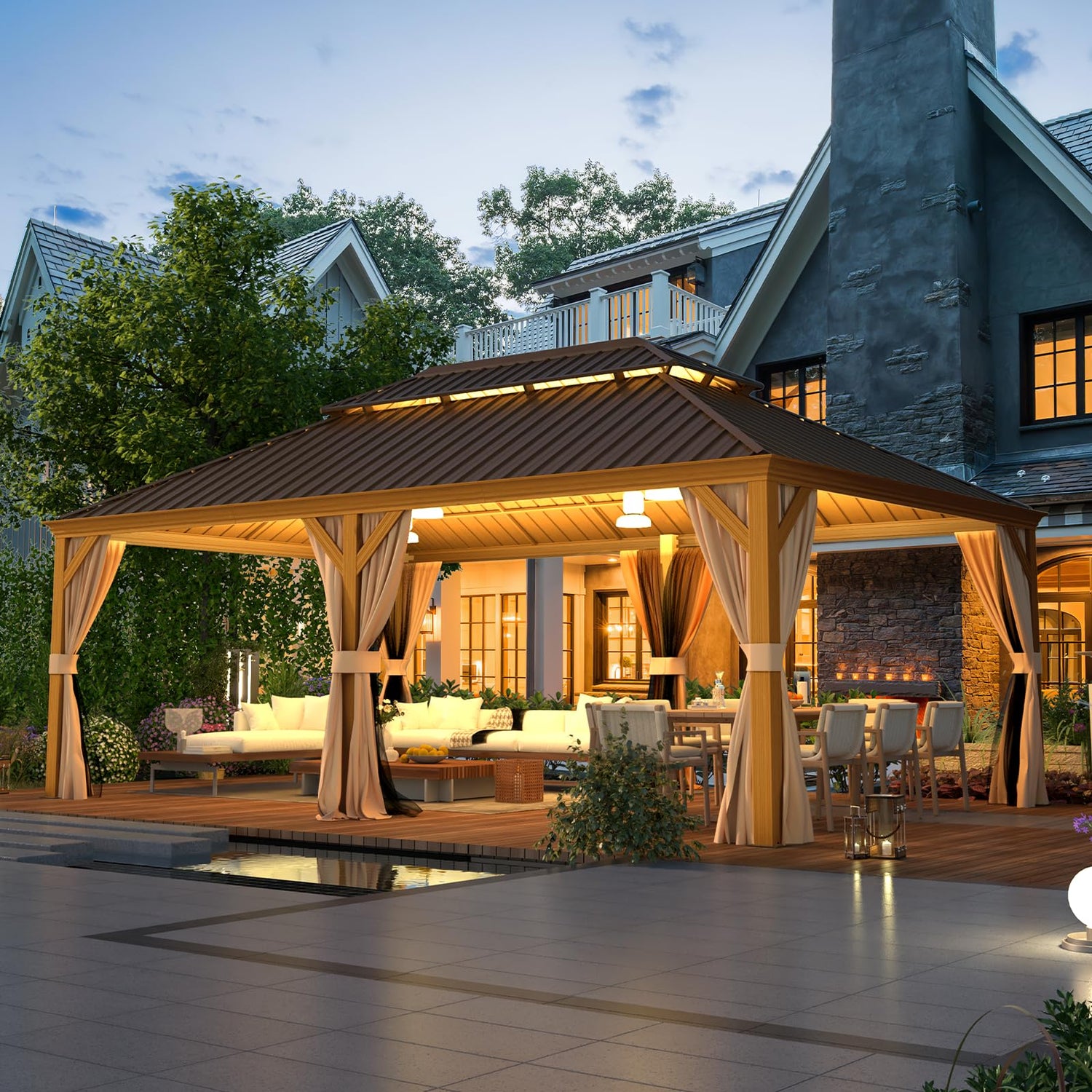 EROMMY 12' x 22' Gazebo, Wooden Finish Coated Aluminum Frame Canopy with Double Galvanized Steel Hardtop Roof, Outdoor Permanent Metal Pavilion with Curtains and Nettings for Patio, Backyard and Deck