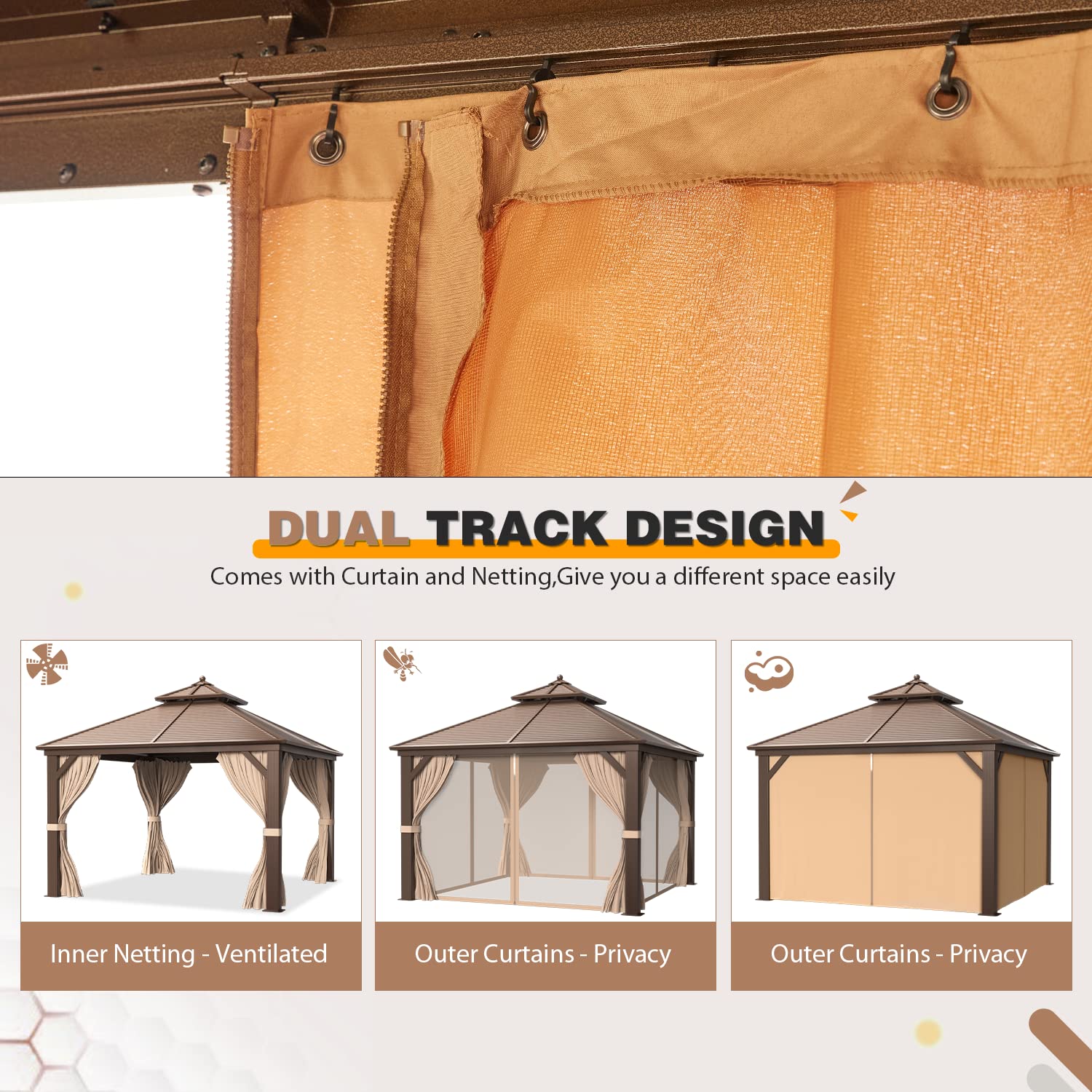 - -NETTING & CURTAINS:The gazebo curtains are made of 180G M2 polyester fabric and PU, which is CPAI-84 certified, flame resistant.Detachable curtains and netting can be adjusted through dual-track seperatly, offer a fully sheltered privacy space, while having sufficient airflow and visibility.Fully enclosed zippered double layer sidewall protect you from UV rays while adding more privacy.