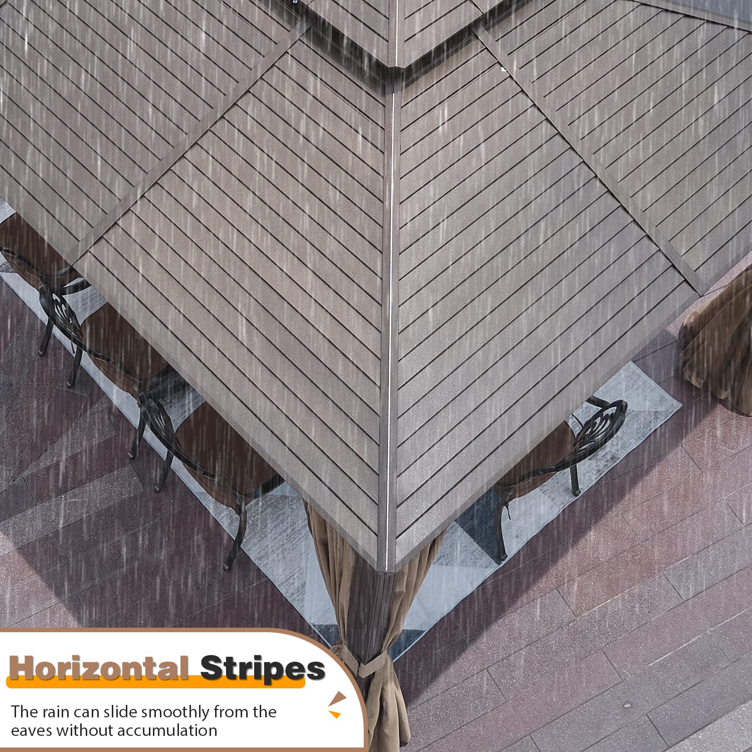 - -VENTED DOUBLE HARDTOP:Compared with one layer design, this double gazebo canopy allows sunlight to filter though and provides excellent airflow and the sloped roof allows rainwater to slide right off. Hardtop gazebos for patios can tolerate high summer temperatures and withstand UV rays,provides you plenty of cool shade to enjoyment.Finally, the interior hooks on the ceiling can be used for hanging the lamp or heater.