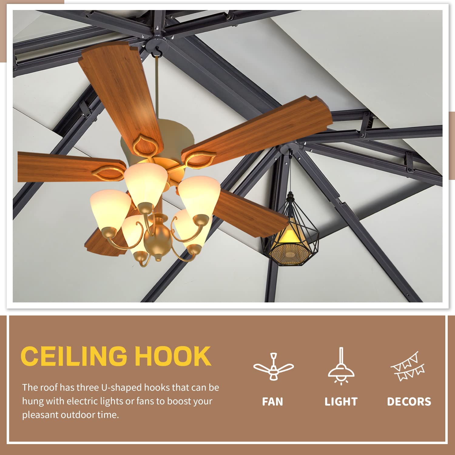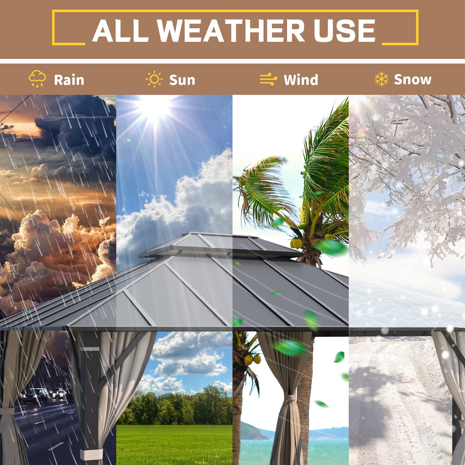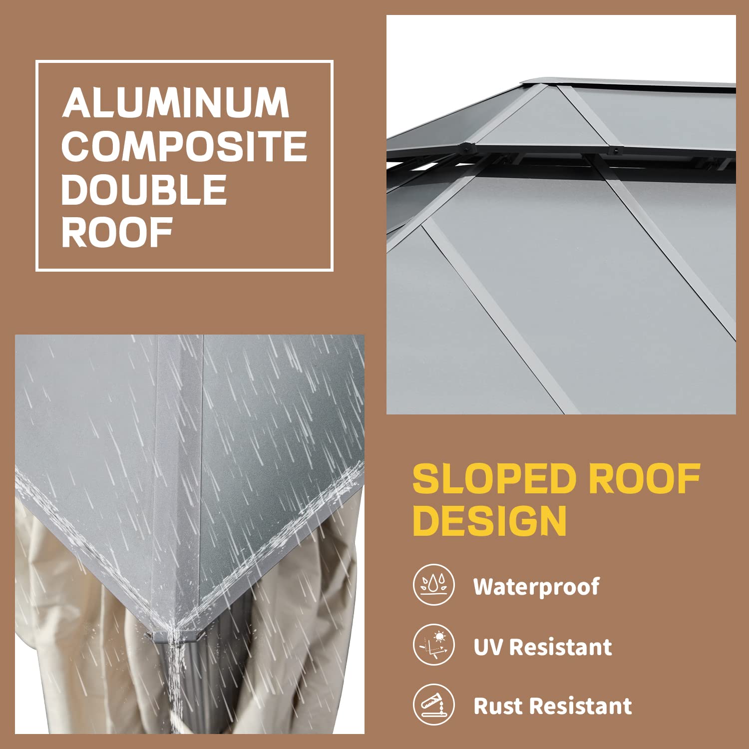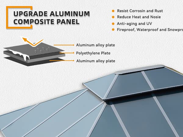 - ALUMINUM COMPOSITE ROOF: The unique aluminum composite roof design makes it easy to insulate sound and heat,especially for the rainy days, you can enjoy a quiet environment inside the gazebo, which is the obvious advantage over the galvanized steel material and the polycarbonate material. This material has better performance in rust resistance and last longer, it can effectively block all the harmful rays and has a better snow capacity