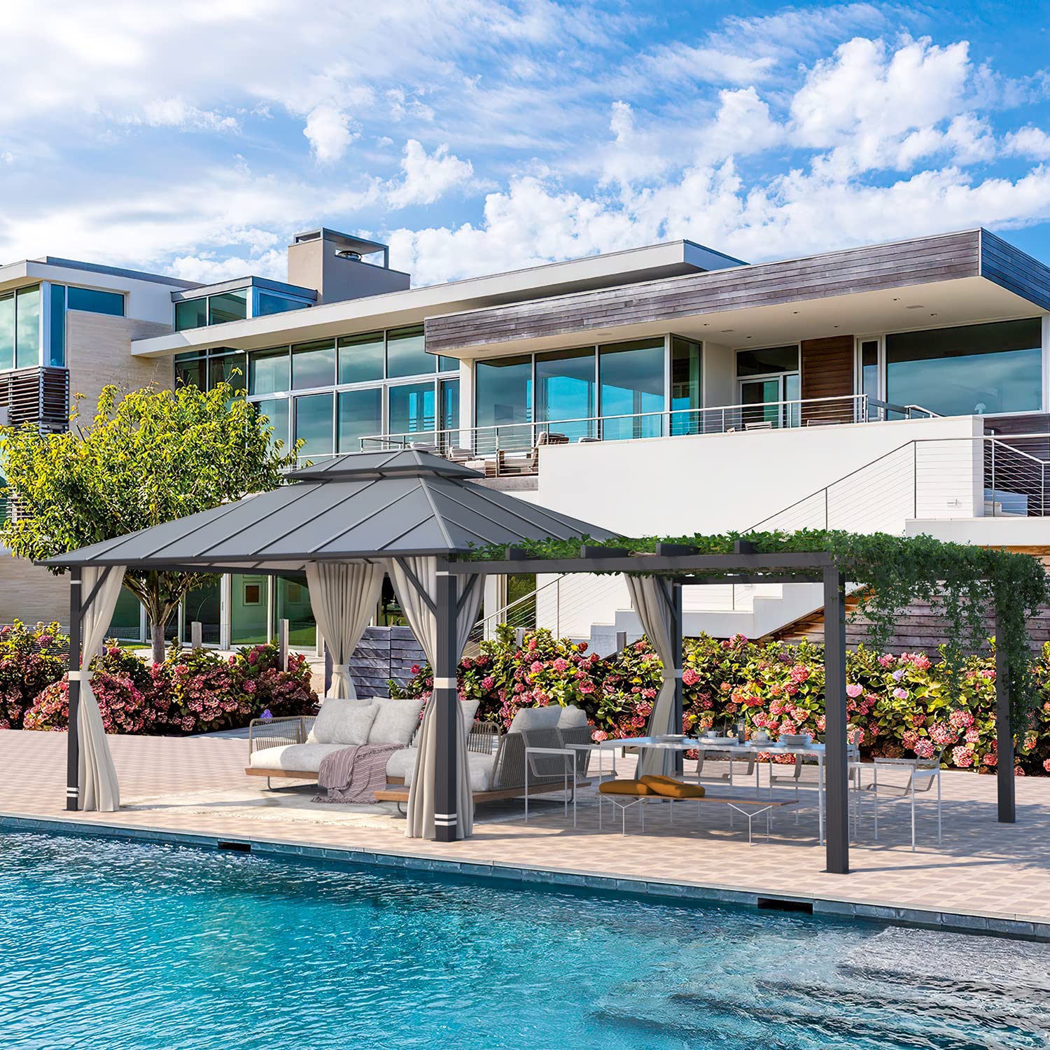 - LARGE ENOUGH SPACE: This hardtop gazebo with pergola is ideal for the pool, hot tub, perfect for outdoor dining or entertainment. Help adds elegance and ambience to your outdoor living space. It is roomy enough to accommodate more than 12 people to attend the party, so that your family can enjoy life at a good time and make the guests feel comfortable and relaxed.