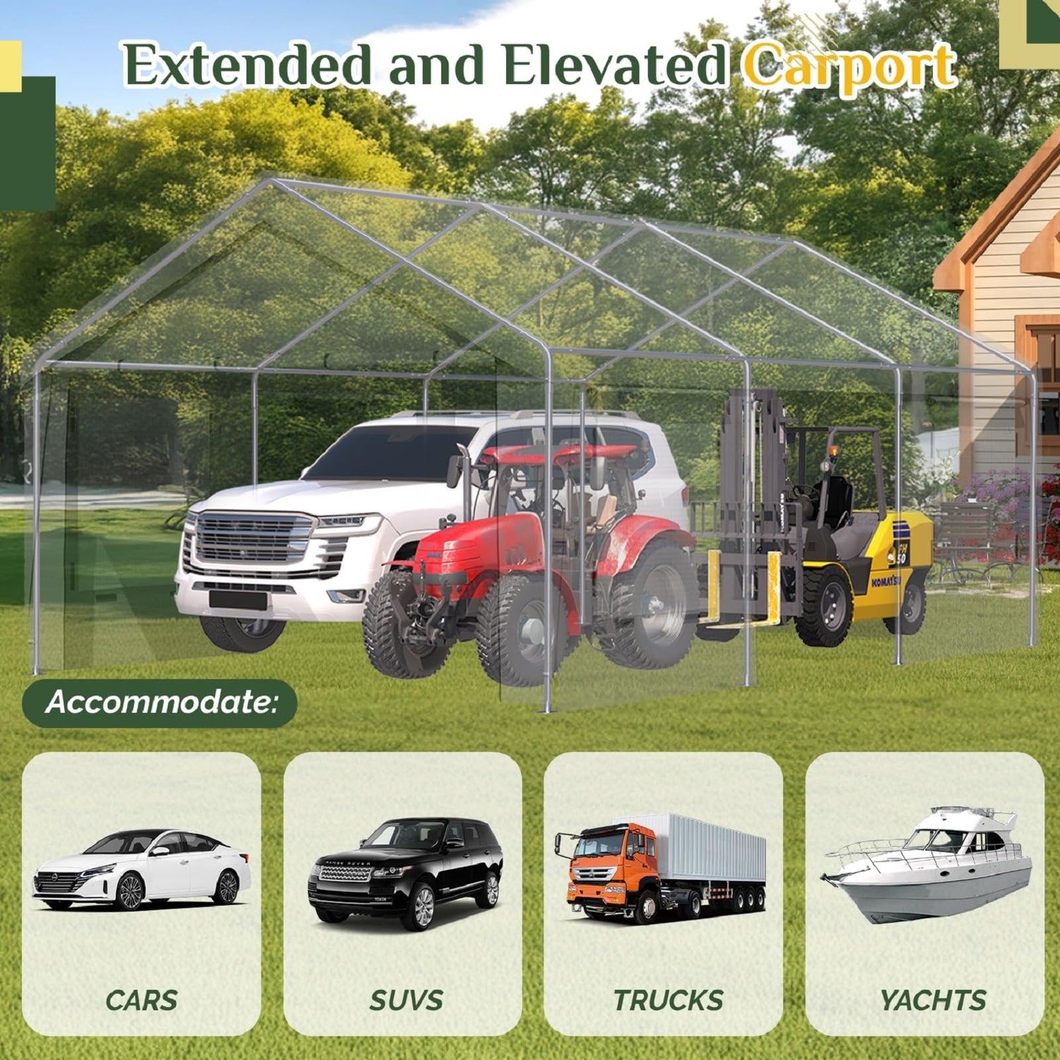 - 【Spacious 13x20FT Carport】The heavy duty carport can parks SUVs, trucks, RVs, or boats effortlessly with a generous 20'L x 13'W x 10'H design! The extra-height roof and wide coverage not only protect vehicles but also store outdoor gear, seasonal items, or workshop tools. Ideal for driveways, backyards, or commercial use