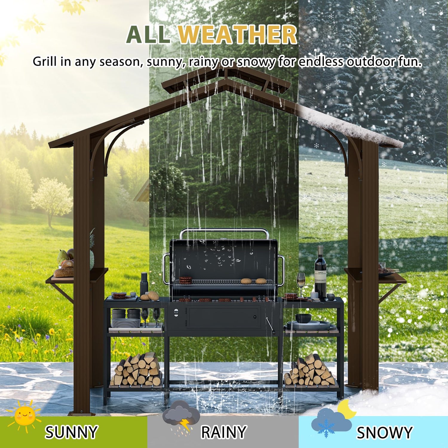 EROMMY 8' x 5' Hardtop Grill Gazebo, Outdoor Metal BBQ Gazebo with Double Galvanized Steel Gable Roof, Permanent Grill Canopy with Side Shelves for Patio Deck Lawn Backyard Garden (Brown)