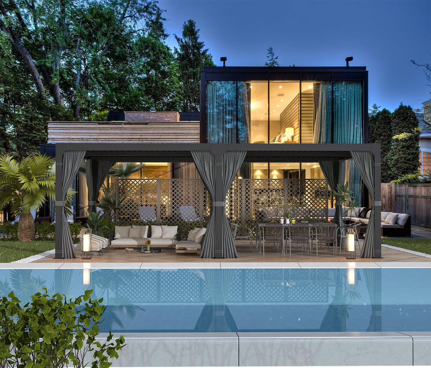 - [ Aesthetics & Protection ] Outdoor pergolas integrate modern design and elegant appearance seamlessly with houses or outdoor spaces. Equipped with removable curtains and mesh screens, one can choose a private area and create a comfortable and versatile living zone, making it an ideal place for gatherings and dining.