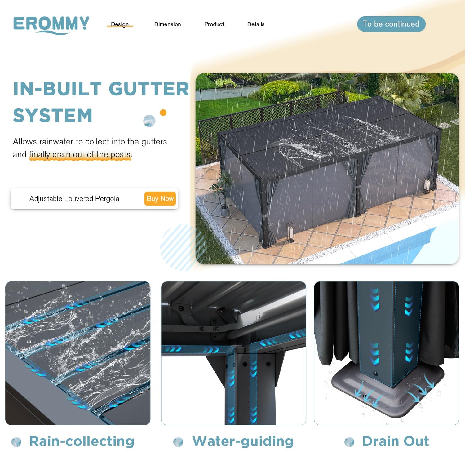 - [ Install & Service ] The components of the EROMMY 12x24 louvered pergola are easy to identify, and the assembly instructions are straightforward and easy to understand. By following the steps in the manual, the installation can be completed by 3-4 people in approximately 2-3 hours. Our service team will respond promptly to any issues.