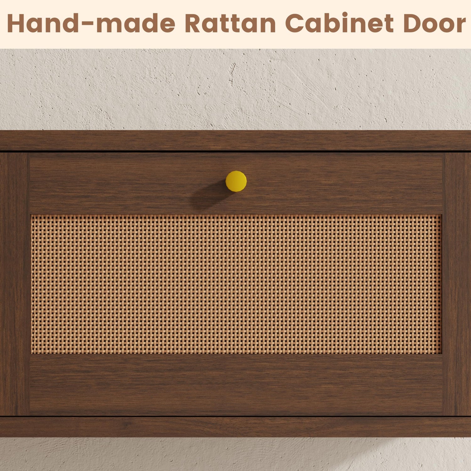 EROMMY Modern Rattan Floating TV Stand, Rectangular Wall-Mounted Floating Stand for TVs with Doors, Entertainment Center for Under TV Storage, 57 inch, Caramel Oak