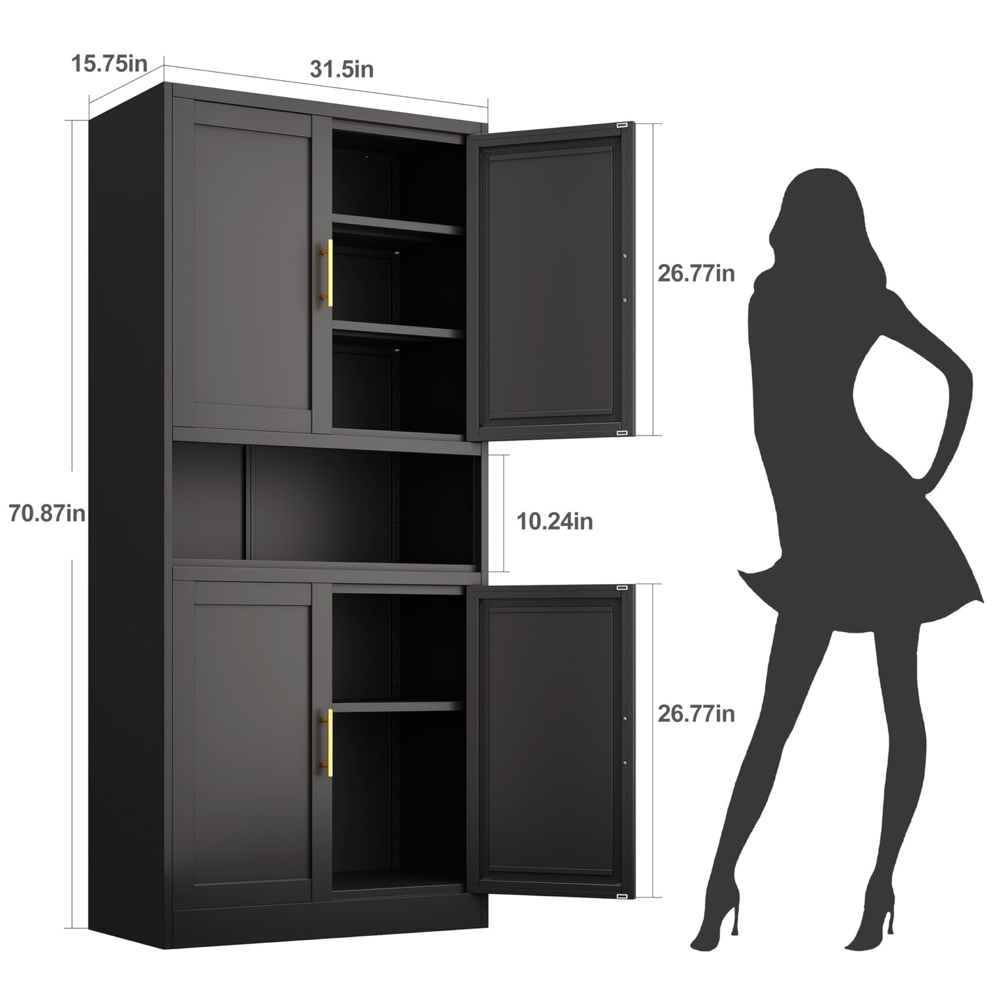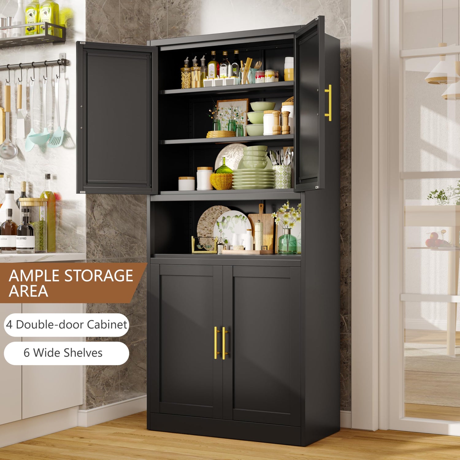 Introducing the 71”H Versatile Metal Pantry Storage Cabinet from erosoei—your ultimate storage solution that combines functionality with elegance. This stunning black 4-door design is crafted from high-quality cold-rolled steel, ensuring durability that will stand the test of time.