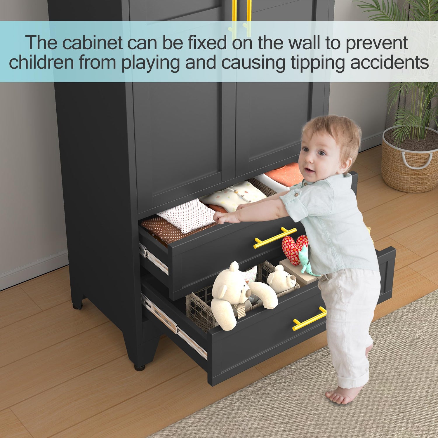 - 【Safe and Practical Design】Our metal locker storage cabinet comes with adjustable partitions and free hanging rods, making it easy to store large items. It also has two drawers, which can store small items such as underwear, socks, toys, etc. There are fixing holes inside the cabinet to secure it to the wall, preventing the cabinet from tipping over.