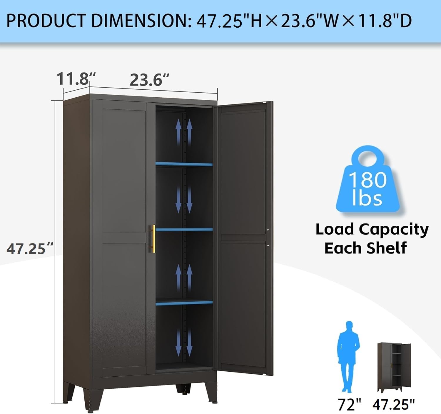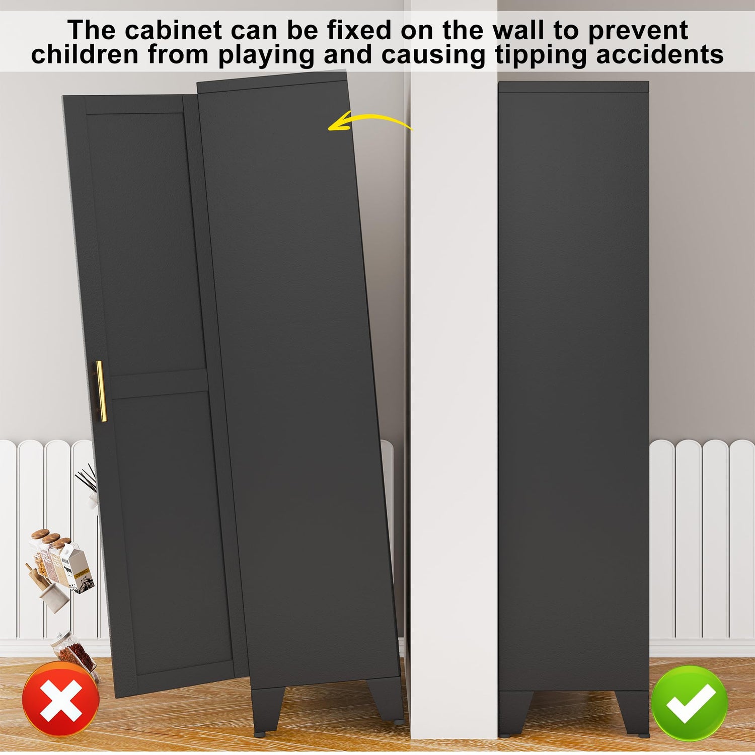 - 【Multiple Uses】Whether you need kitchen pantry storage for cutlery, plates, or spices, or manage bathroom towels and toiletries, laundry room odds and ends, and more, this metal storage cabinet is an ideal choice.Whether you're using it in your office, garage, or living room, this cabinet is sure to impress.