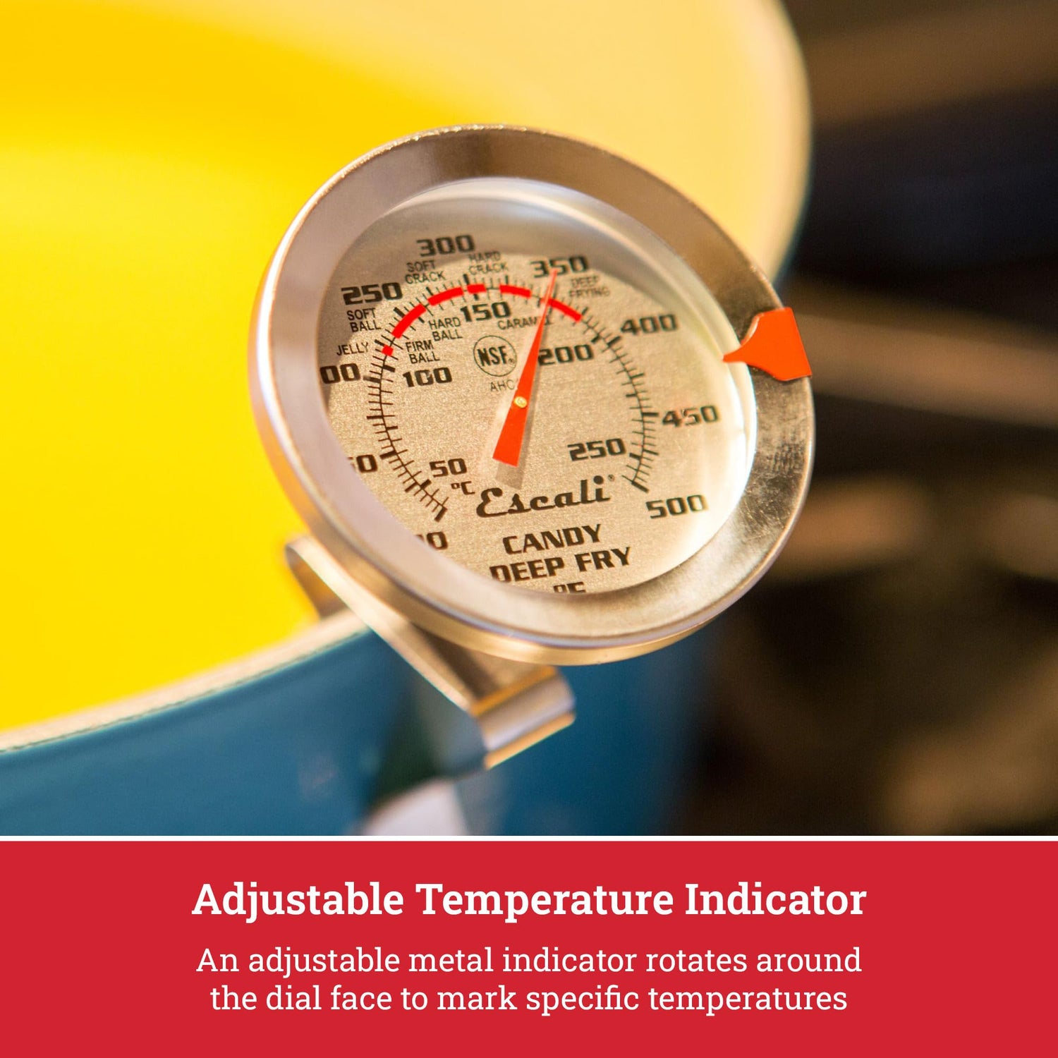 Details: Short Stem Probe: The Escali Candy / Deep Fry Thermometer will help you cook candy or deep fried foods to the perfect consistency. The easy to read dial display features various confectionary cooking temperatures and an adjustable temperature indicator for quick reference. Its durable stainless steel design is NSF certified, oven safe and dishwasher safe. Confectionary Temperature Zones: The dial face includes temperature zones indicating jelly, soft ball candy, firm ball candy, hard ball candy, hard crack candy, caramel and deep frying temperatures. Adjustable Temperature Indicator:: An adjustable metal indicator rotates around the dial face to mark specific temperatures. NSF Certified: The manufacturing process of this product is regularly checked and certified by the National Sanitation Foundation and meets the highest standards for public health protection. Hands-free Vessel Clip: A stainless steel clip holds the thermometer in a pot, or any vessel, for continuous hands free measurements. Large Easy to Read Dial: The large dial is easy to read, shatterproof and features both fahrenheit and celsius measurements. Oven Safe: The durable stainless steel construction allows the thermometer to be used in an oven or grill. Dishwasher Safe: The premium stainless steel construction is durable and dishwasher safe.