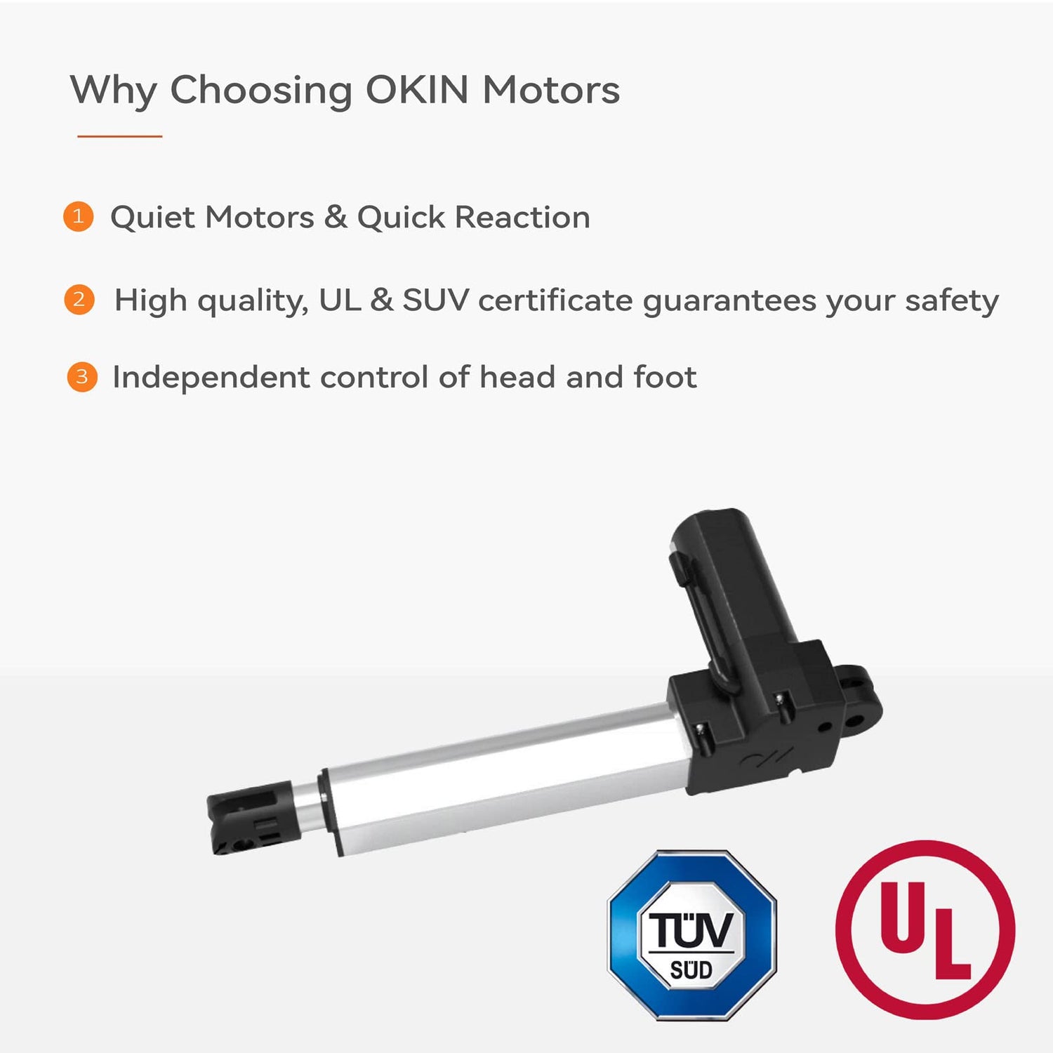 - MASSAGE WITH OKIN MOTORS - All ESHINE adjustable bed frame use the German engineered OKIN motor system, including massage and foot and head Incline. Full body massage with 3 intensity levels, 3 modes including wave, pulse and constant with a 10 to 30-minute timer option, your family member will love electric adjustable beds.