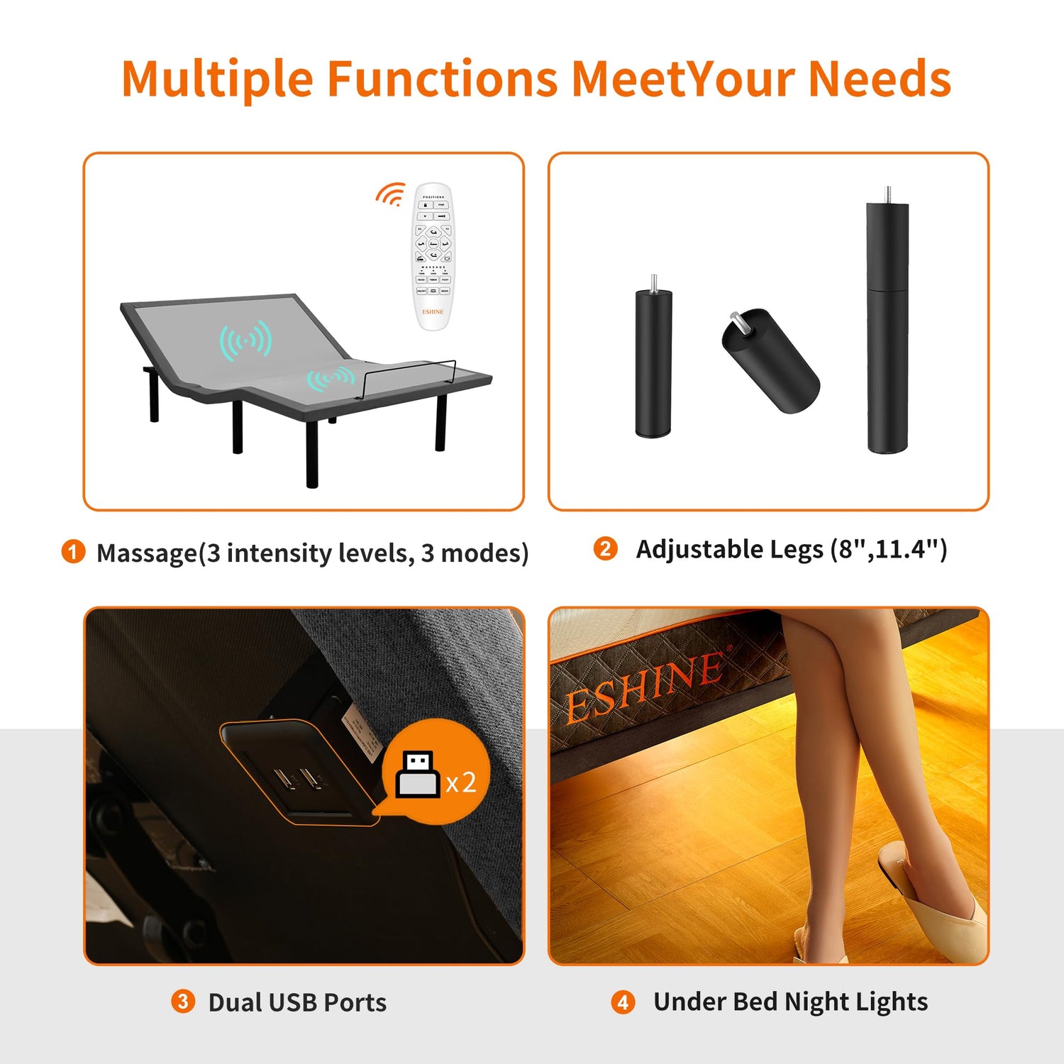 - MULT-FUNCTION DESIGN: Adjustable legs allows you adjust the height to 8 inches,11.4 inches.For our adjustable bed frame, many humanized designs (USB Ports and Under Bed Night Lights) will make your life very convenient.