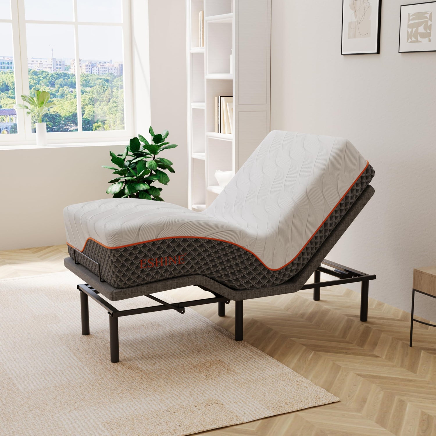 - ESHINE TWIN XL ADJUSTABLE BED GREY WITH MATTRESS - Including 14" twin xl mattress (319 independent springs) and twin xl adjustable bed frame. This adjustable bed frame has head and foot incline option which can head to 55° and foot up to 42°. Enhance comfort and sleep with full articulation by ergonomic design, which lets you always have a comfortable position to sleep, watching TV and reading.