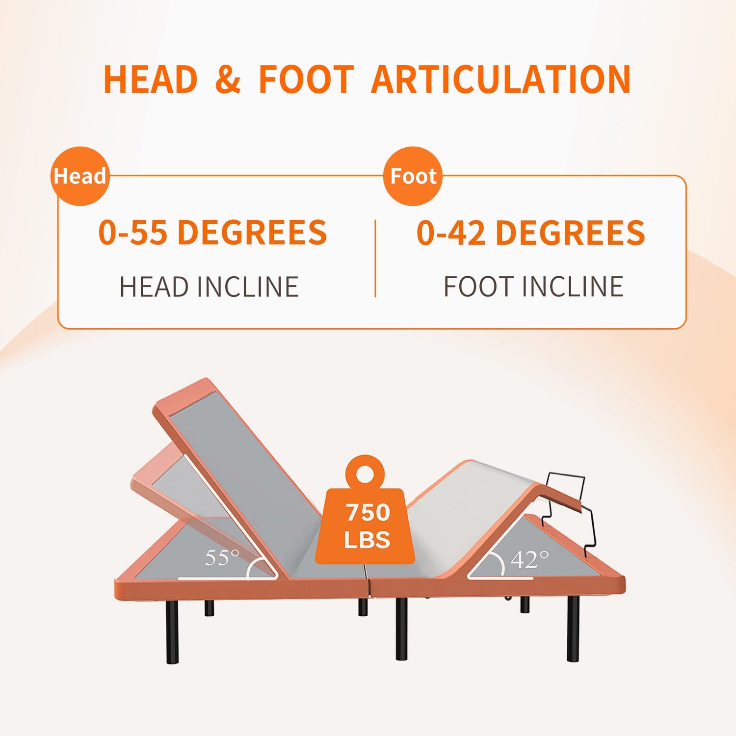 - ADJUSTABLE BED BASE KING - King adjustable bed frame owns the head and foot incline option which allow the head to be adjusted up to 55°and the foot up to 42°.
